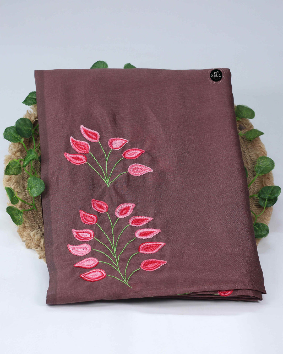 Chocolate Brown Semi Soft Silk Saree with Floral Hand Embroidery