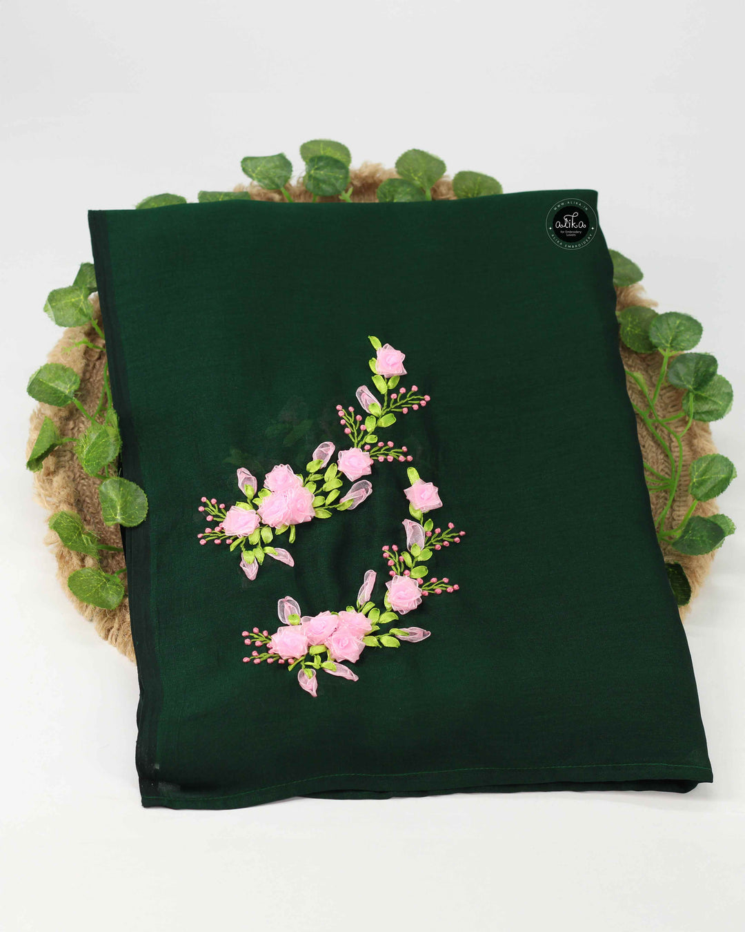 Dark Green Semi Silk Saree with Floral Ribbon Work