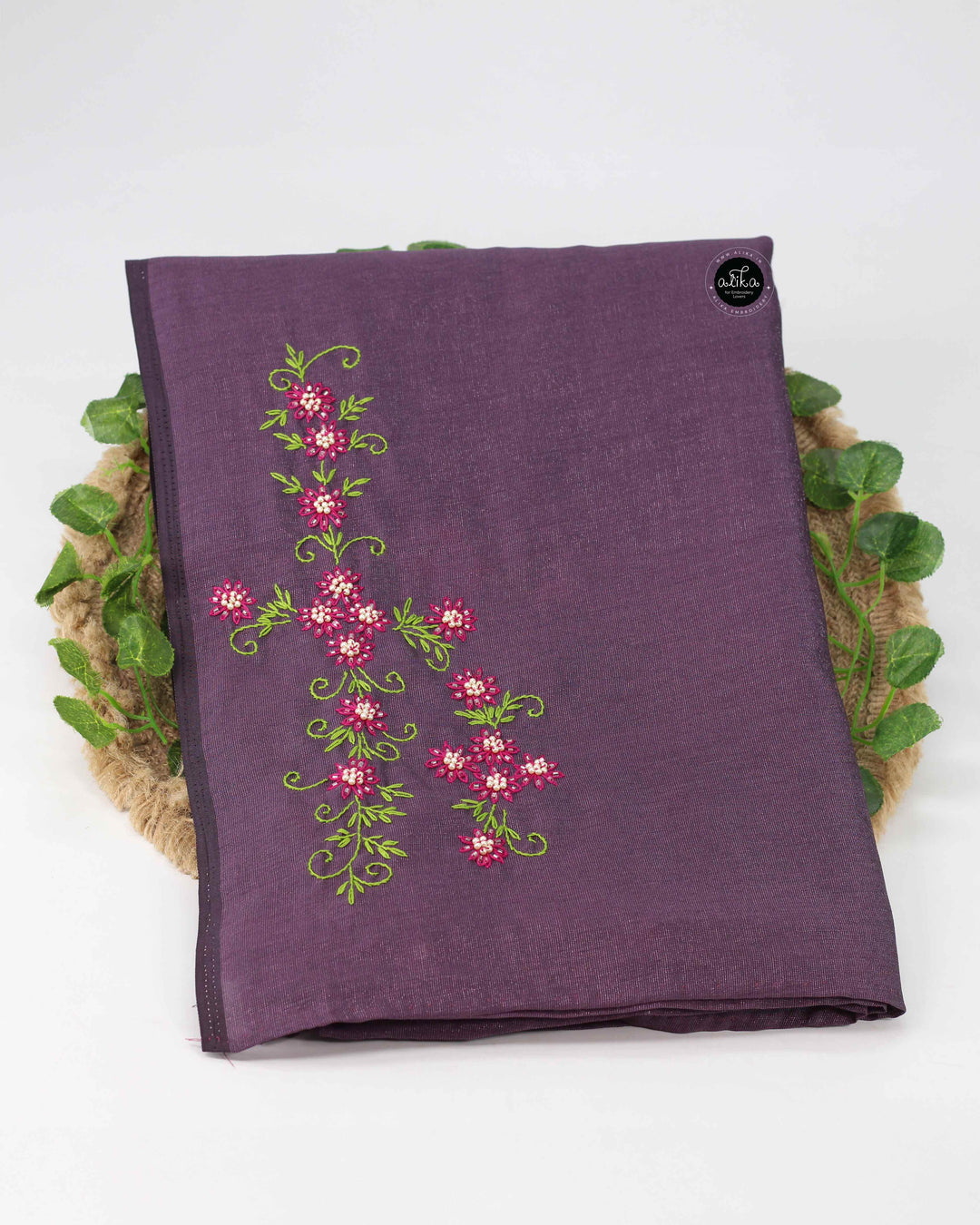 Purple Semi Soft Silk Saree with Floral Hand Embroidery and Bead Work