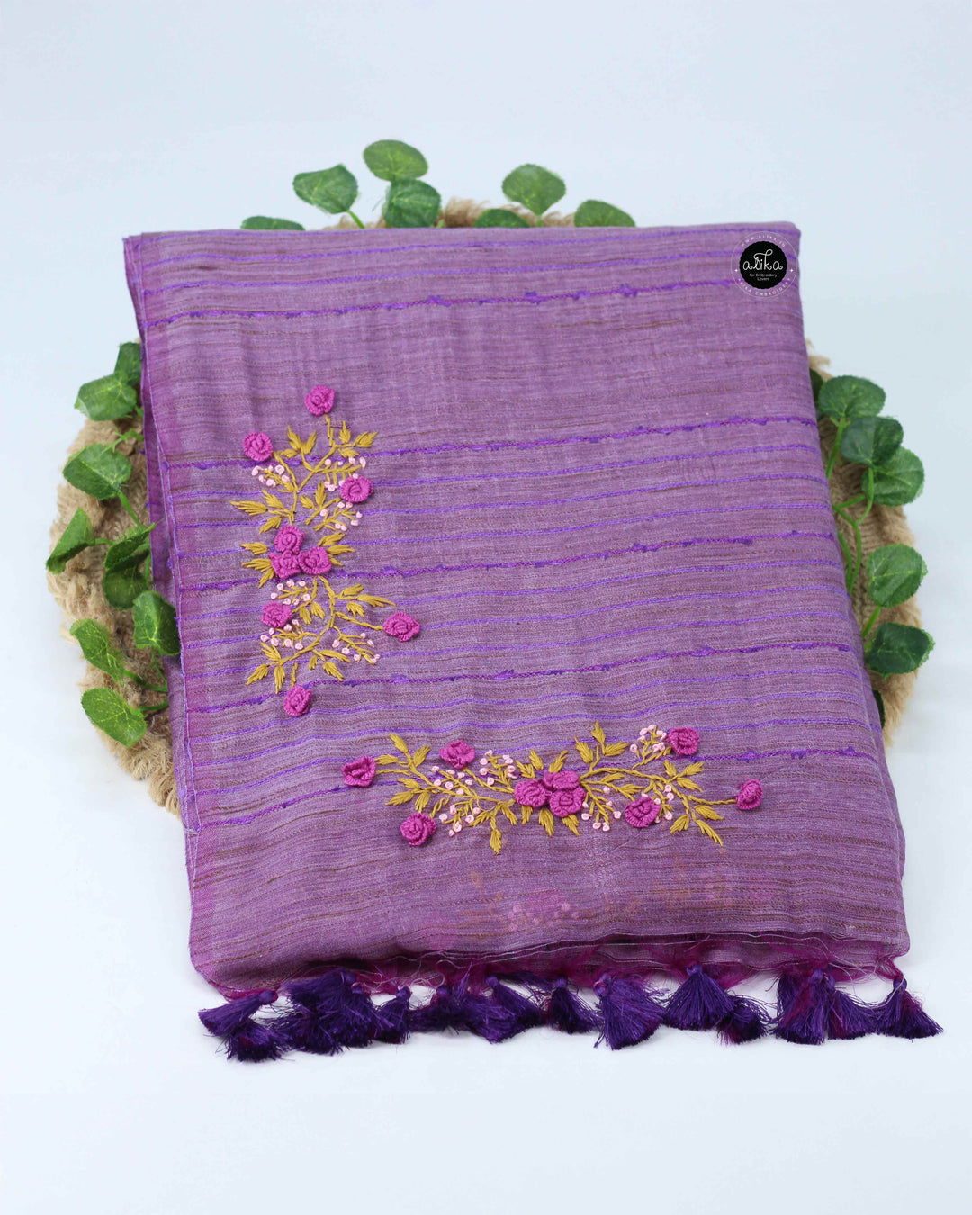 Purple Semi Linen Saree with Floral Hand Embroidery – Elegant Festive Wear