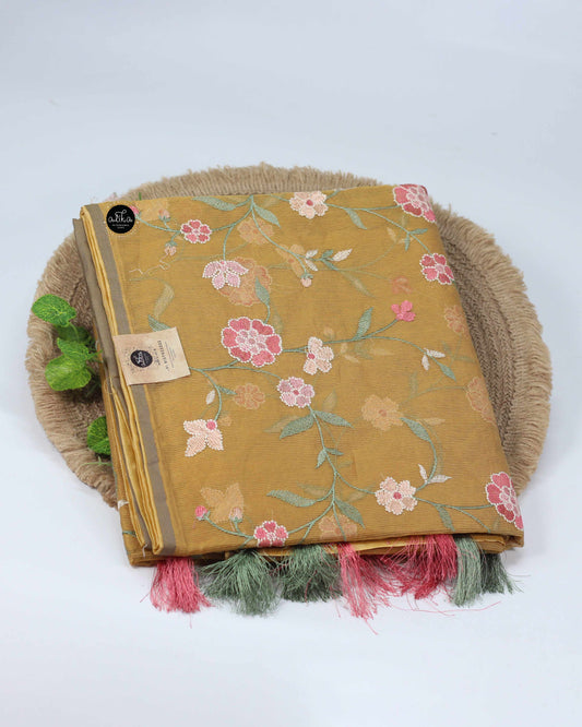 Caramel Brown Tussar Silk Saree with Floral Hand Embroidery