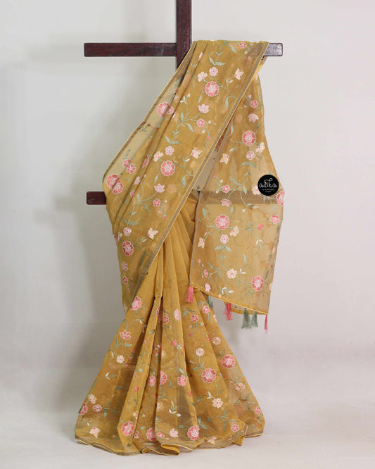 Peach soft tissue organza Saree with Floral Border Embroidery