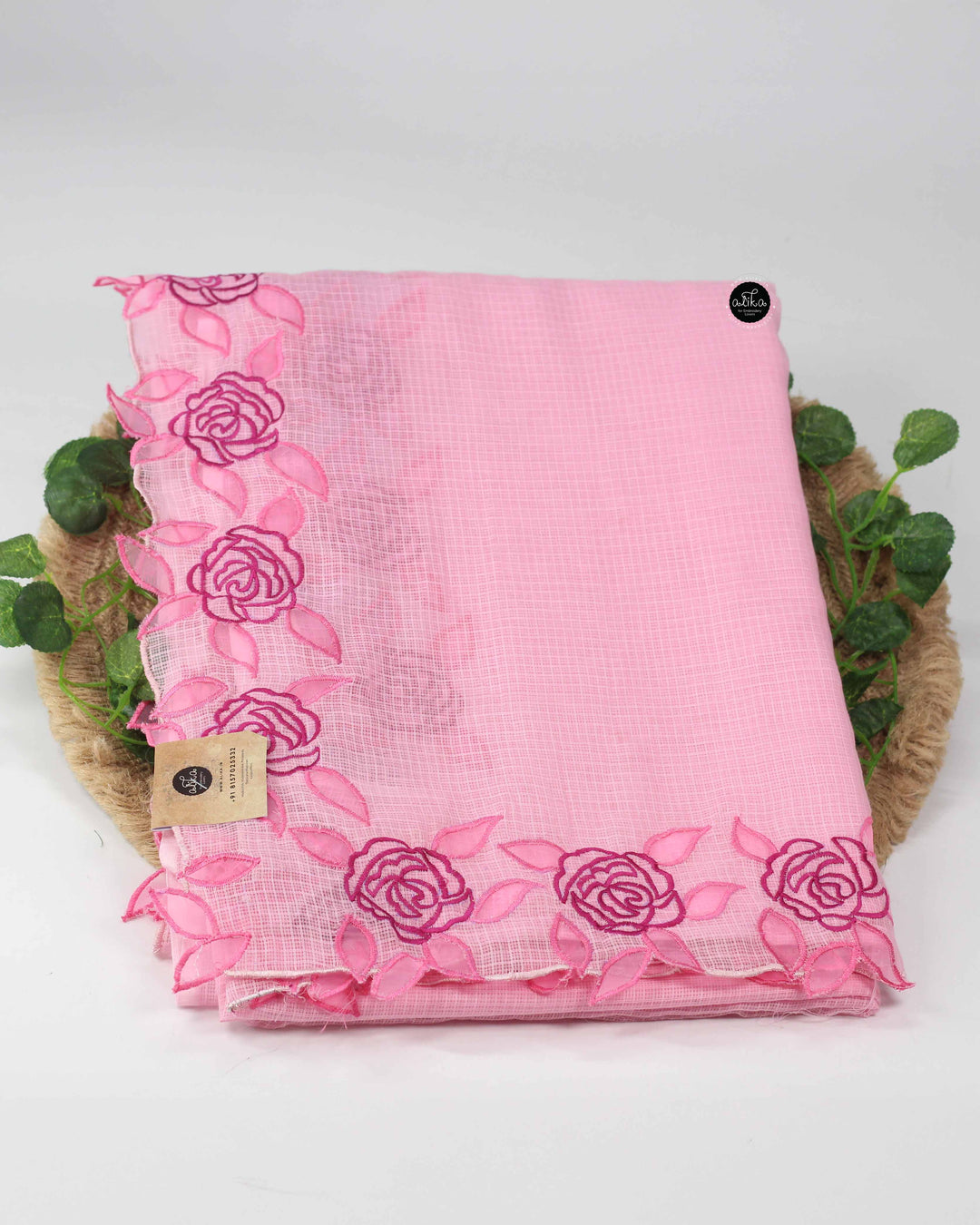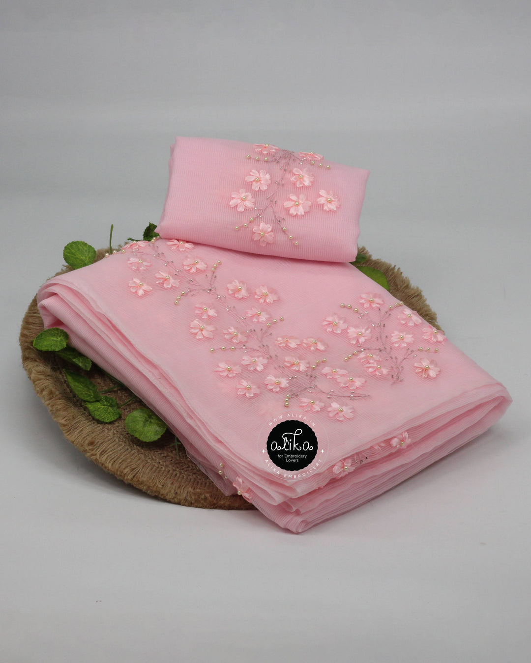 Baby Pink Silky Kota Saree with Floral Net Appliqué Work