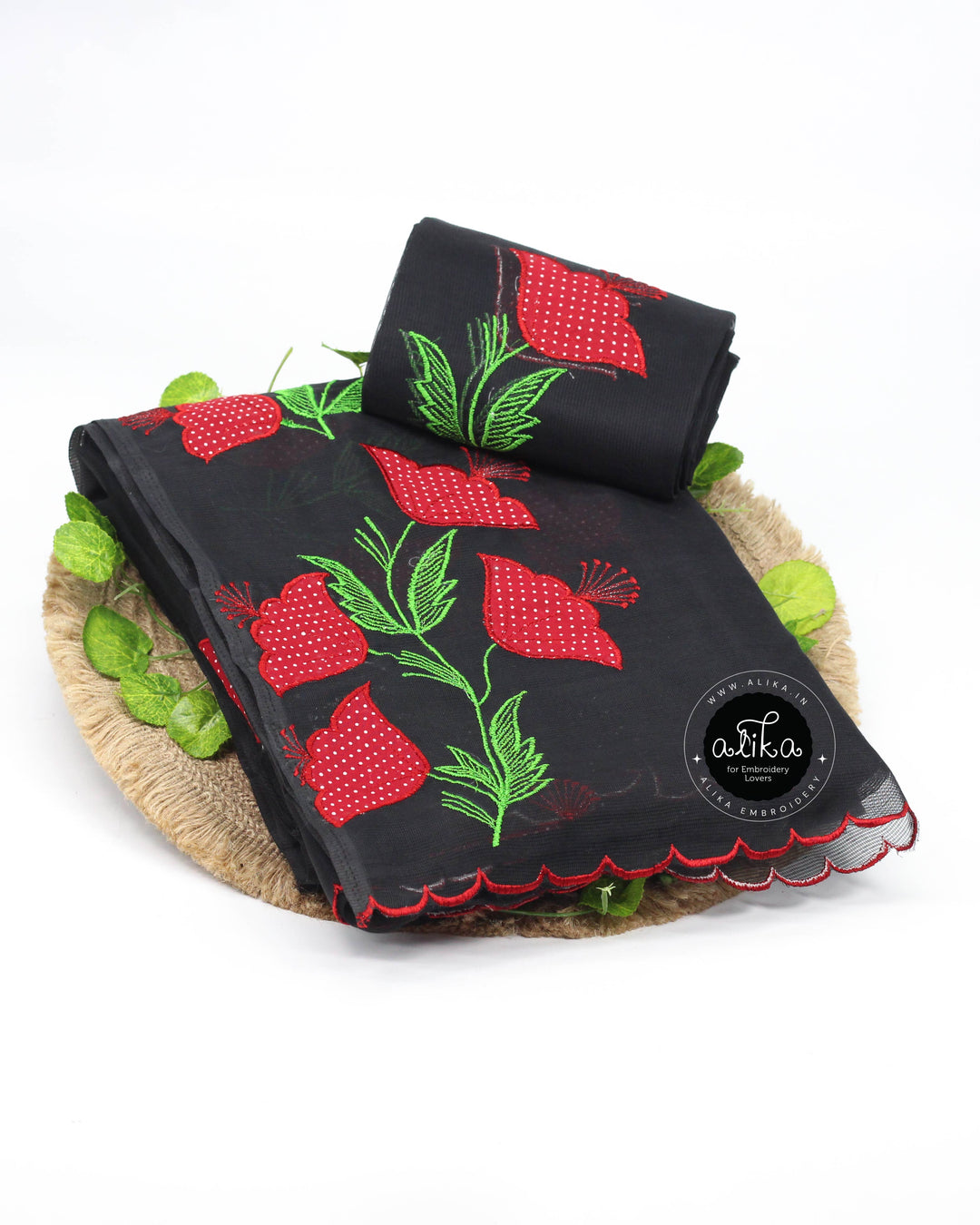 Black Kota Saree with Red Floral Hand Embroidery