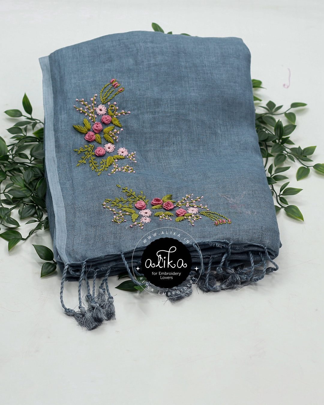 Double Shaded Pure Linen Saree with Floral Hand Embroidery