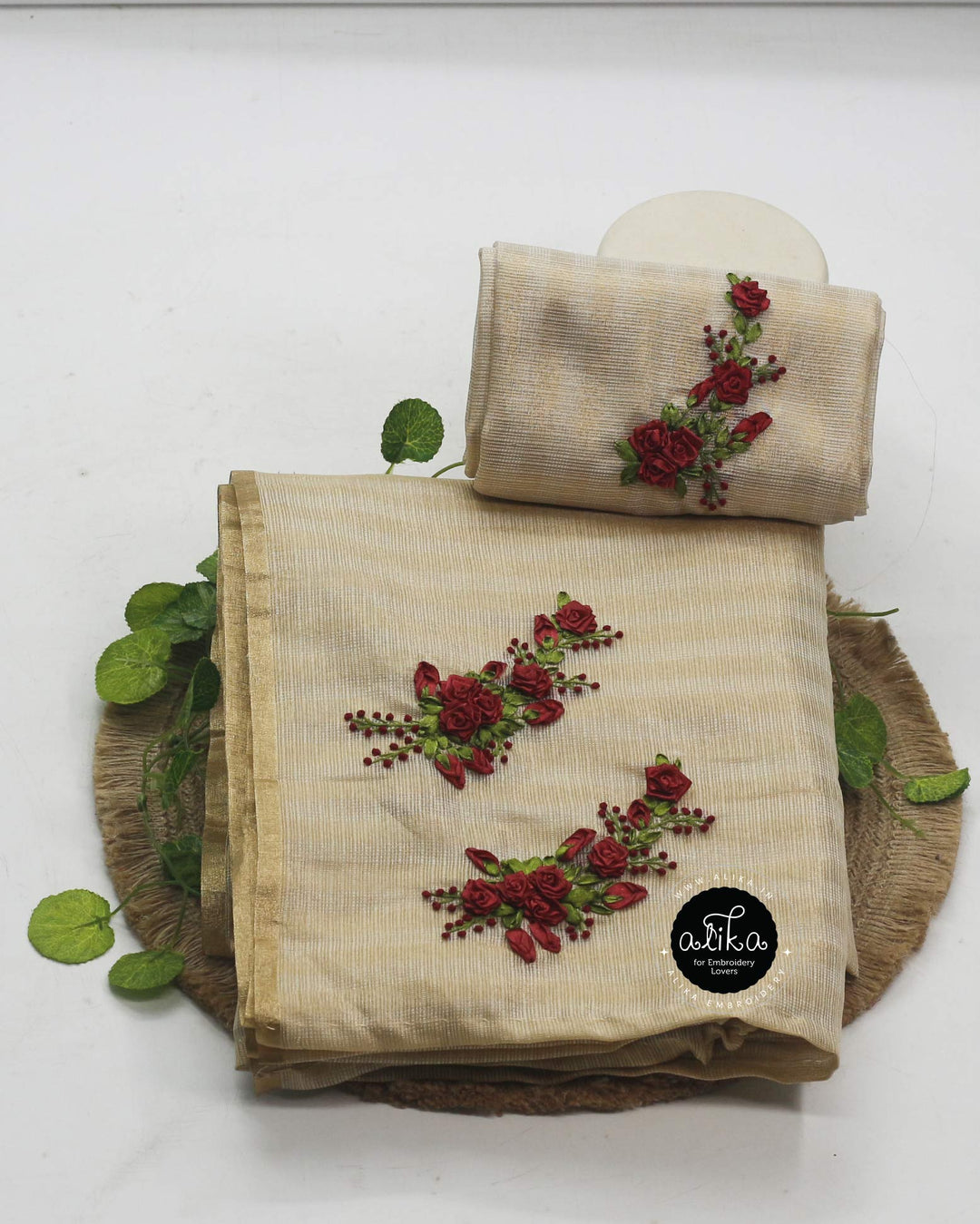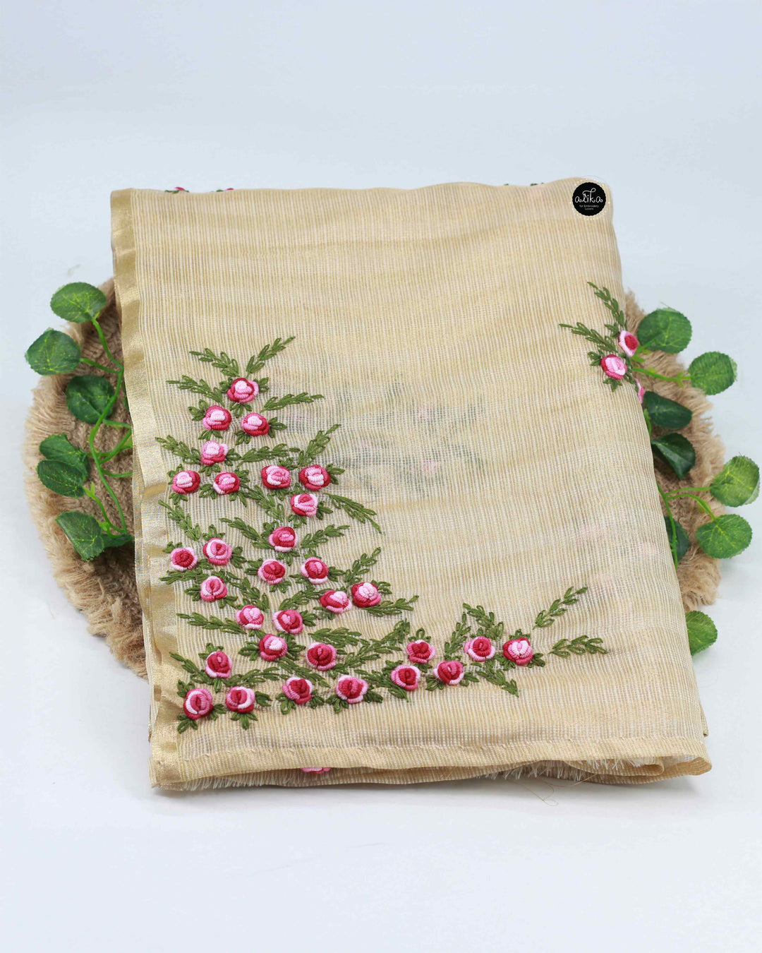 Gold Semi-Tissue Saree with Floral Hand Embroidery