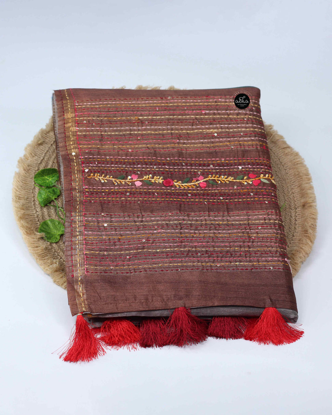 Deep Bronze Crushed Silk Saree with Floral Embroidery & Full Border Cutwork
