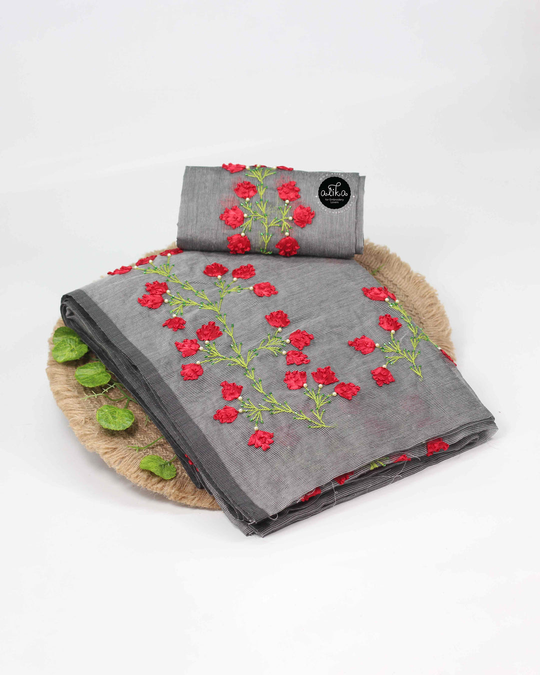 Gray Crushed Silk Saree with Floral Embroidery and Full Border Bead Work