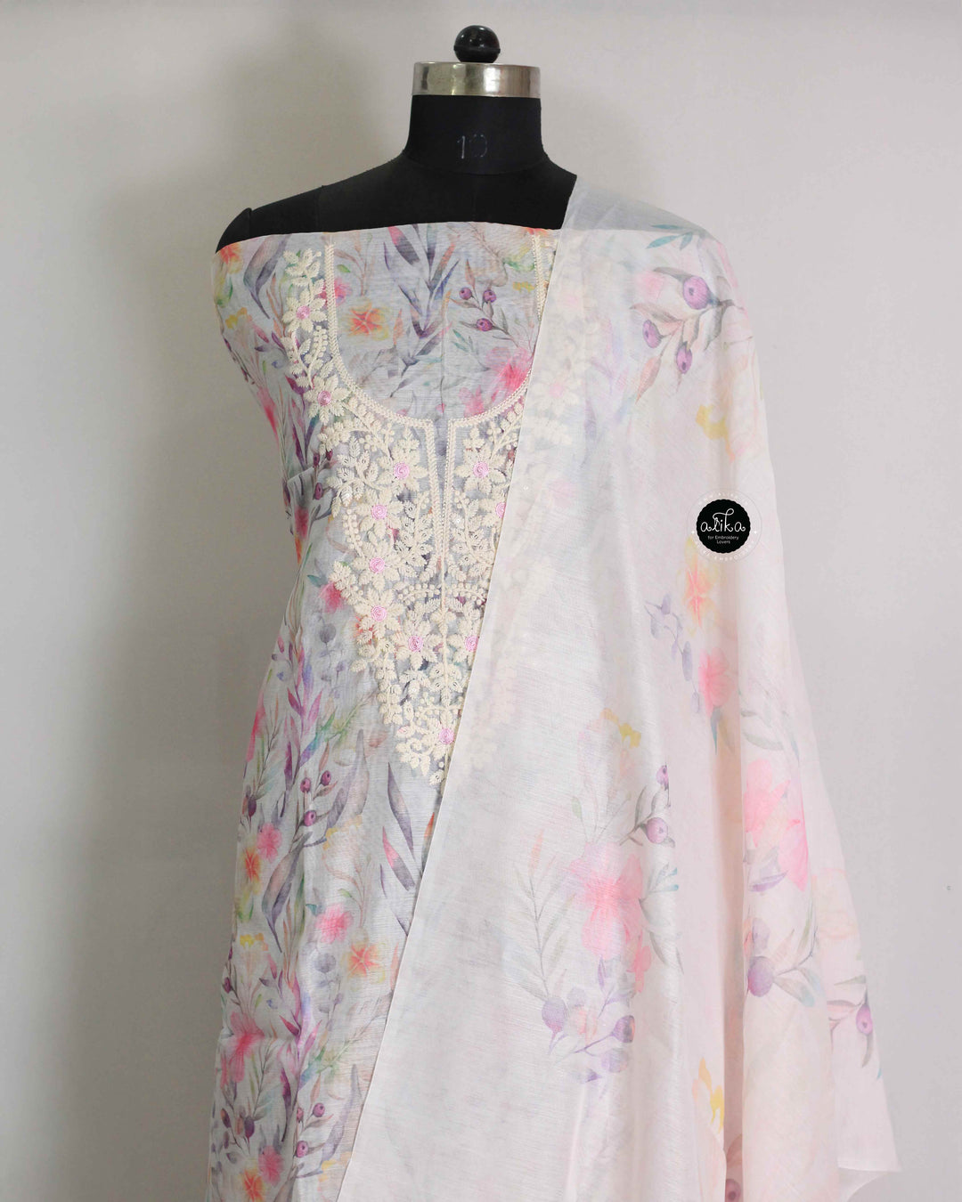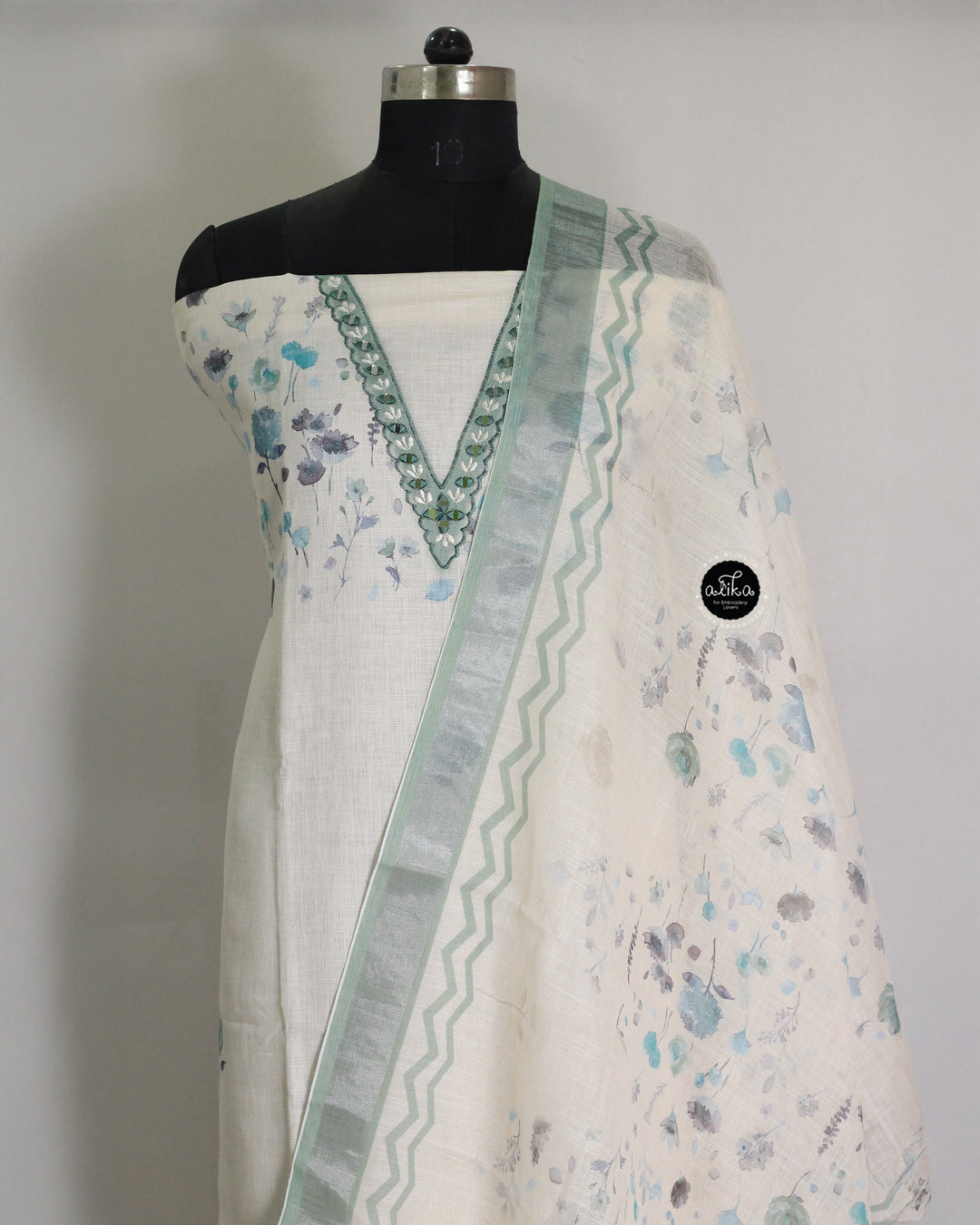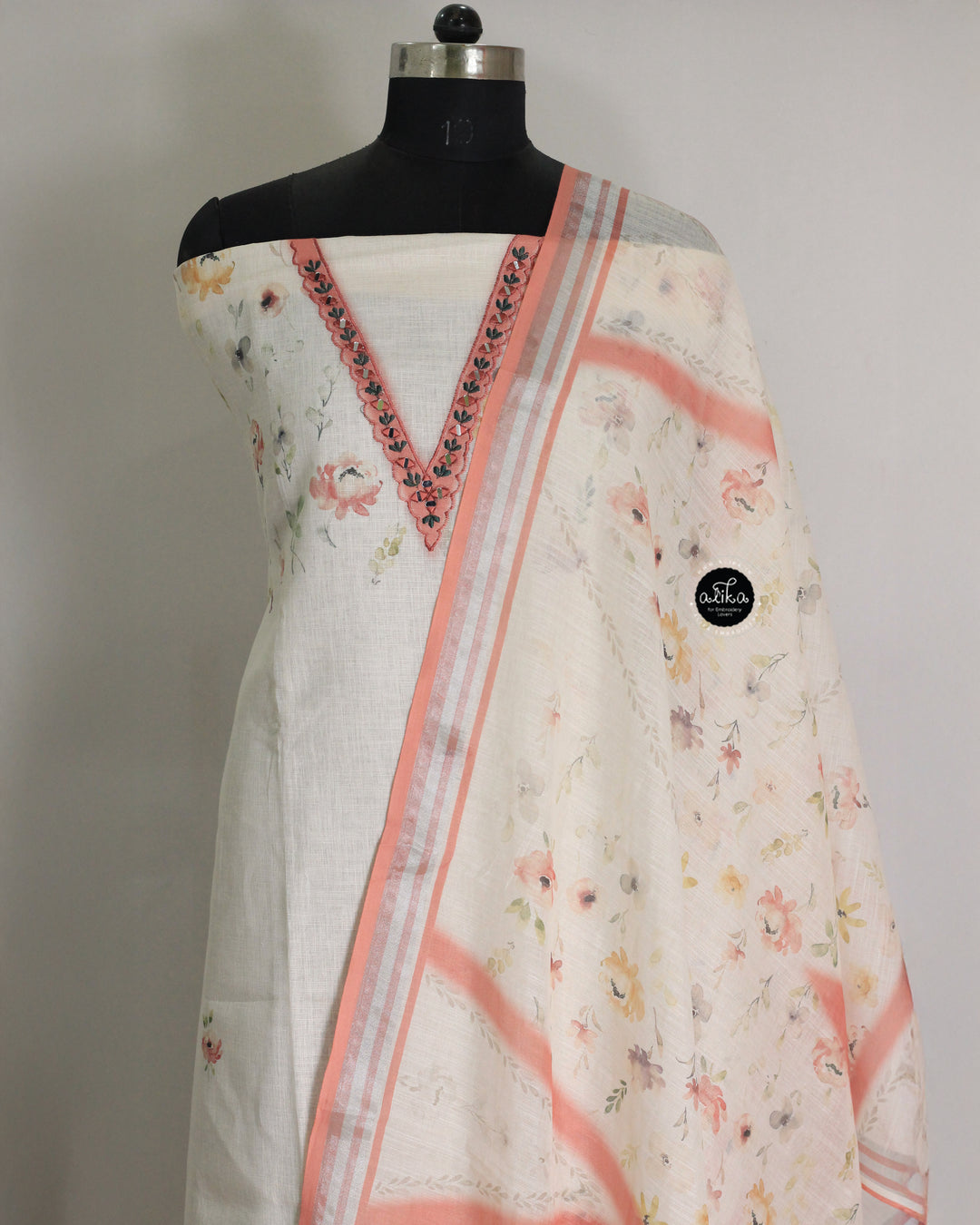 Off-White Linen Unstitched Salwar Set with Floral Prints & Mirror Work
