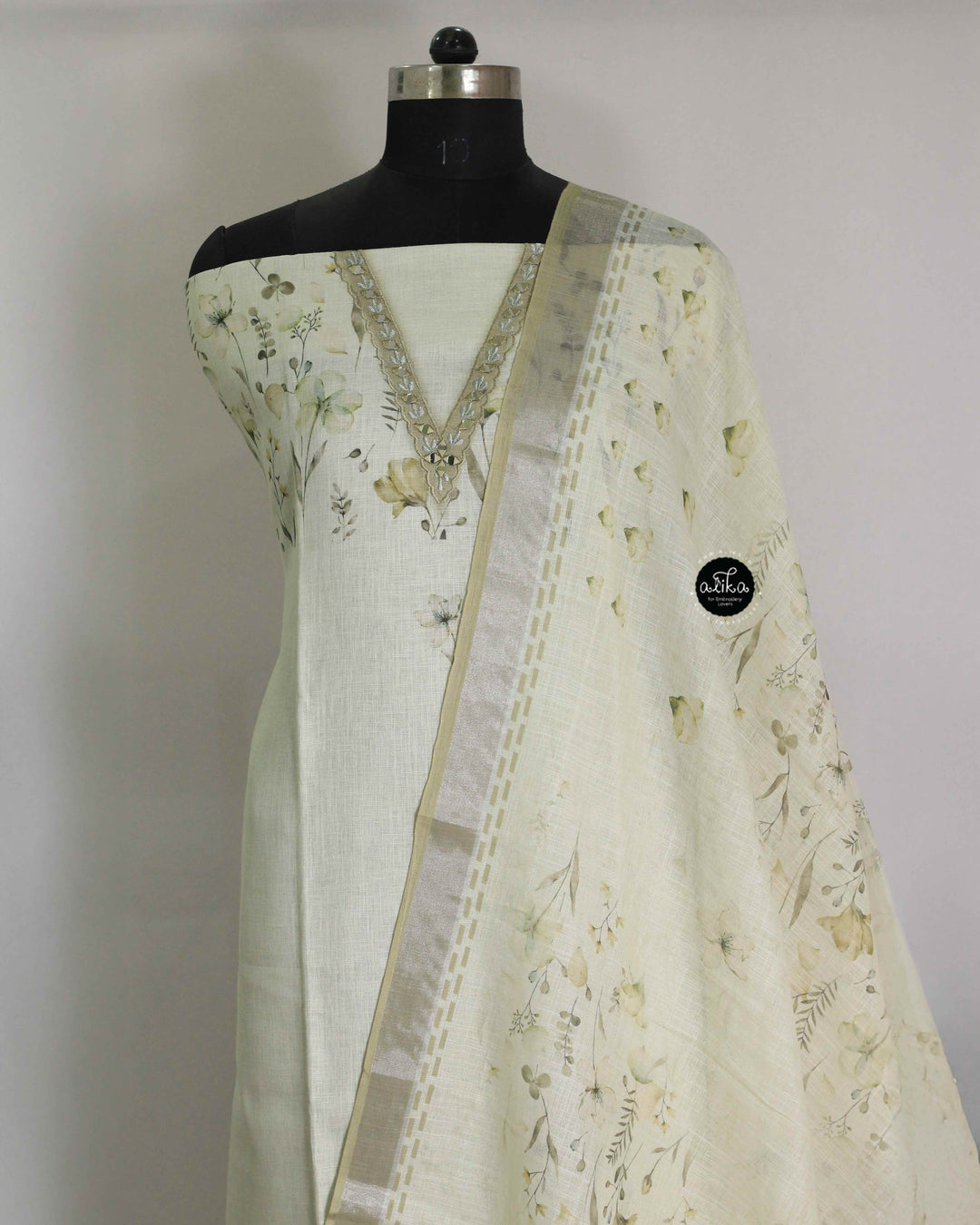 Off White Linen Unstitched Salwar Set with Floral Prints & Mirror Work