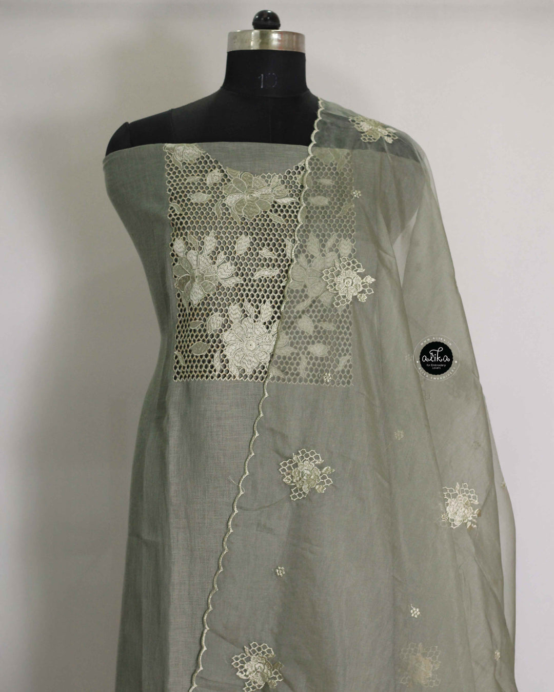 Sage Green Linen Unstitched Salwar Suit with Floral Cutwork