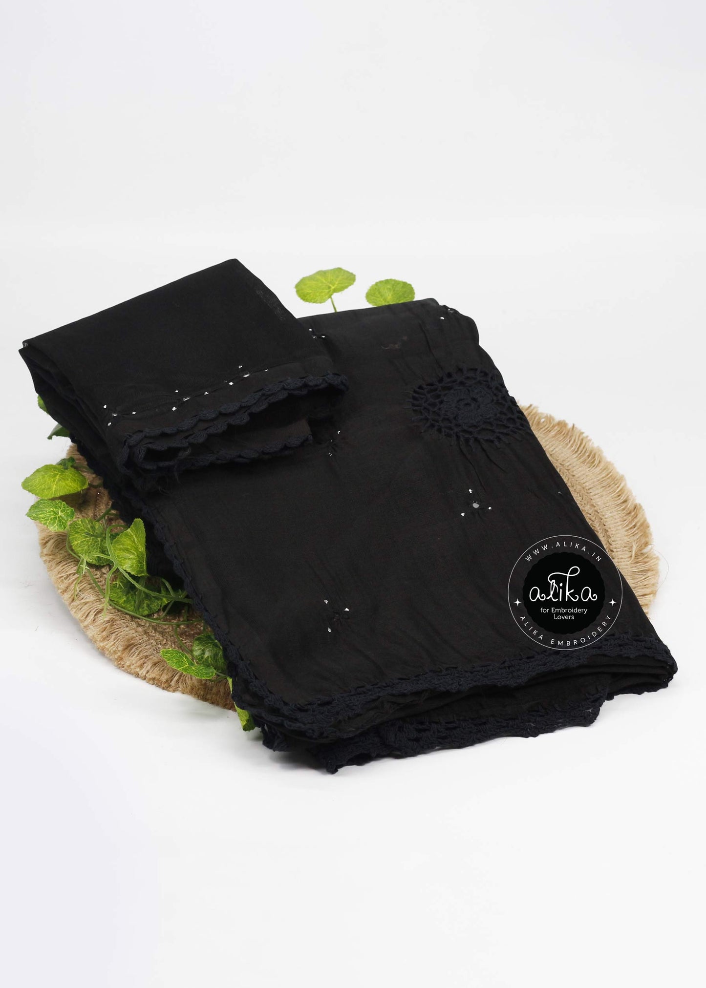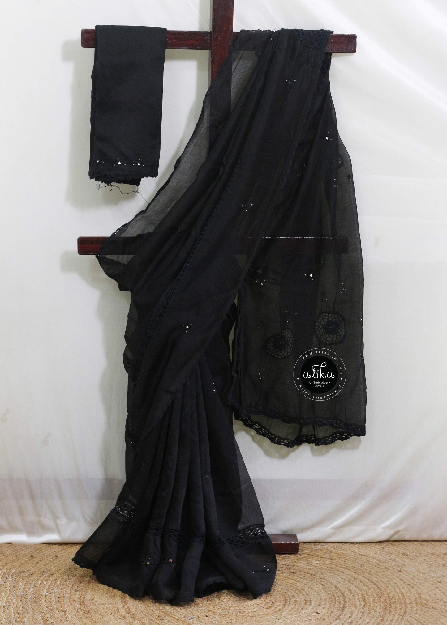 Black Kota Doria Saree with Crochet Detailing Mirror Work by Alika Fashion Store