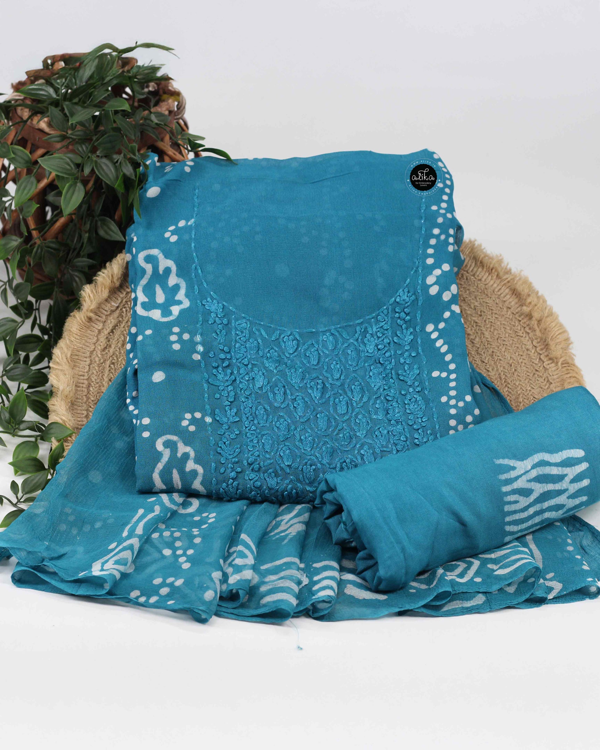 Crafted from lightweight georgette fabric, the suit set offers a soft, fluid drape that feels comfortable and graceful. The rich blue base is enhanced with elegant prints, while delicate hand embroidery adds an artisanal touch that elevates the overall look.