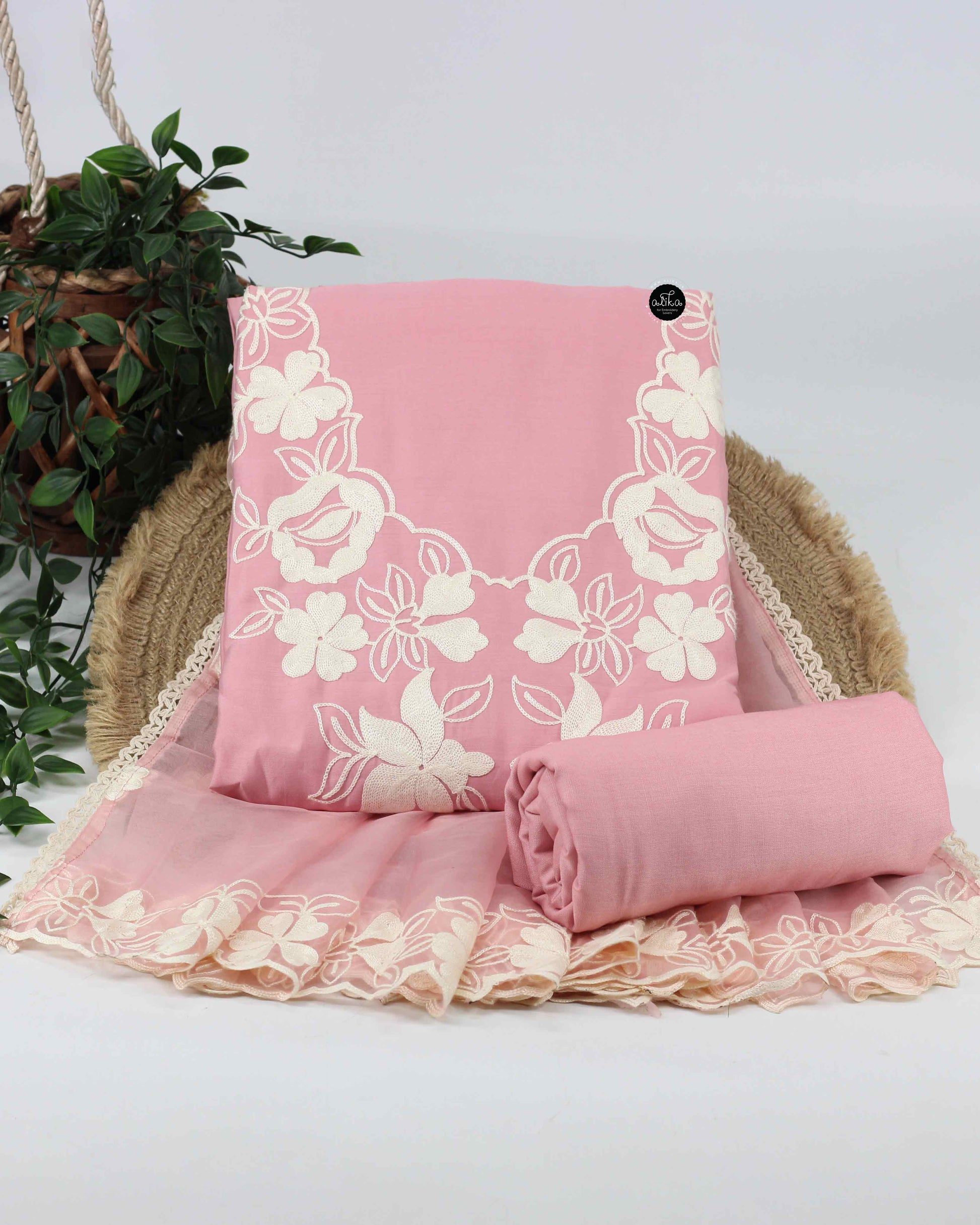 Step into refined luxury with this Blush Pink Semi-Silk Unstitched Salwar Set from Alika Fashion Store, designed for women who appreciate craftsmanship and understated elegance. Featuring intricate floral machine embroidery, this set blends traditional artistry with modern designer aesthetics—perfect for celebrations that call for something truly special.