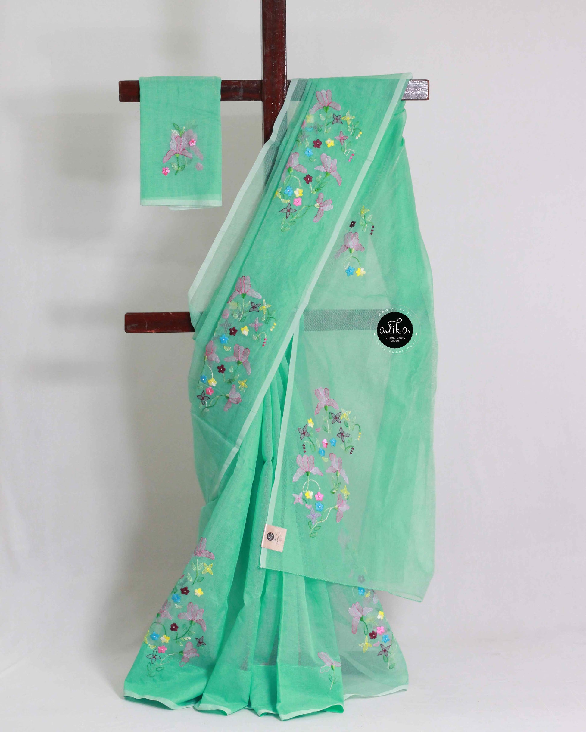 Bright Mint Green Kota Saree with Shadow Embroidery
