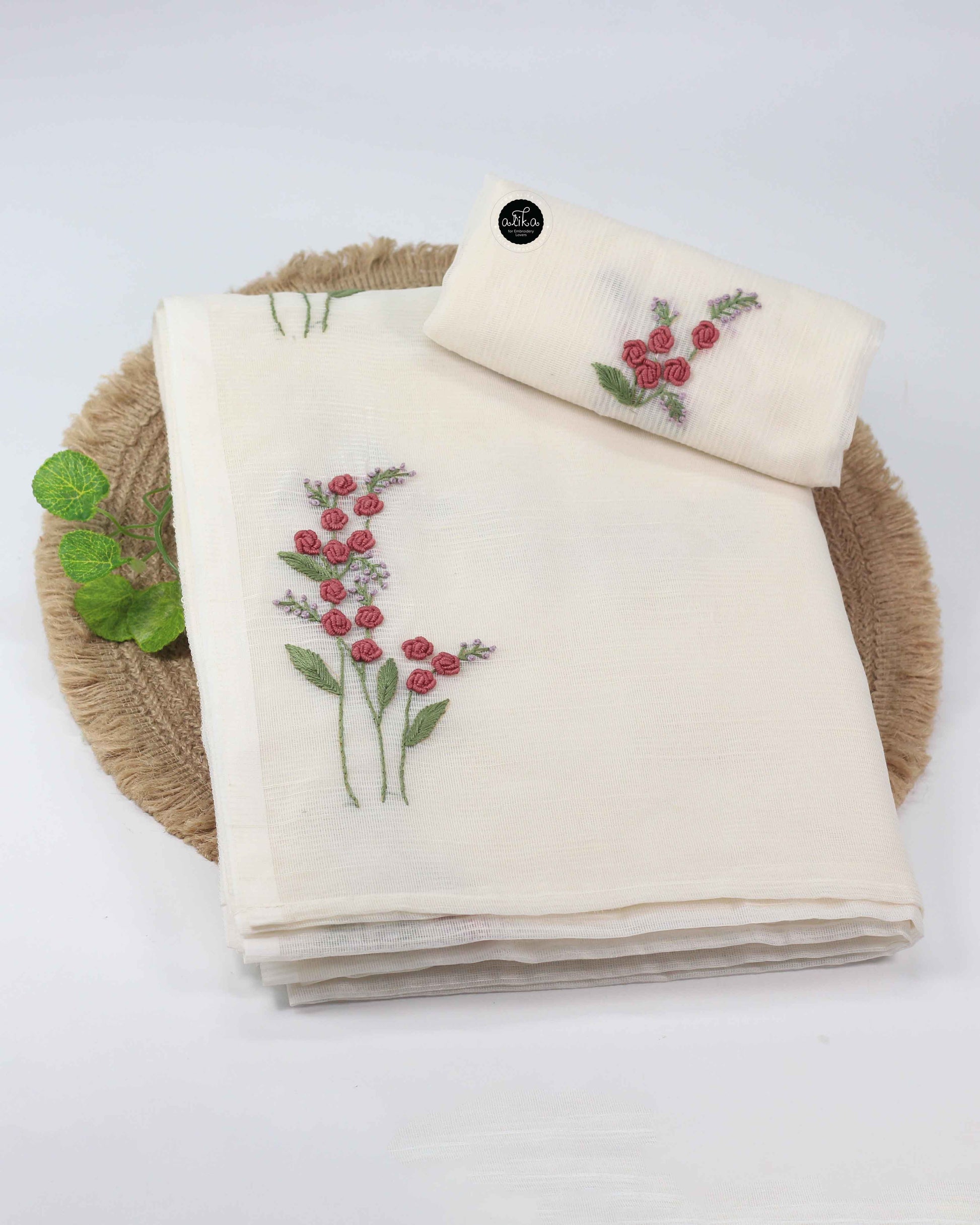 This saree is crafted from lightweight cream Kota fabric, featuring delicate floral bullion embroidery. Ideal for festive gatherings, office functions, or gifting.