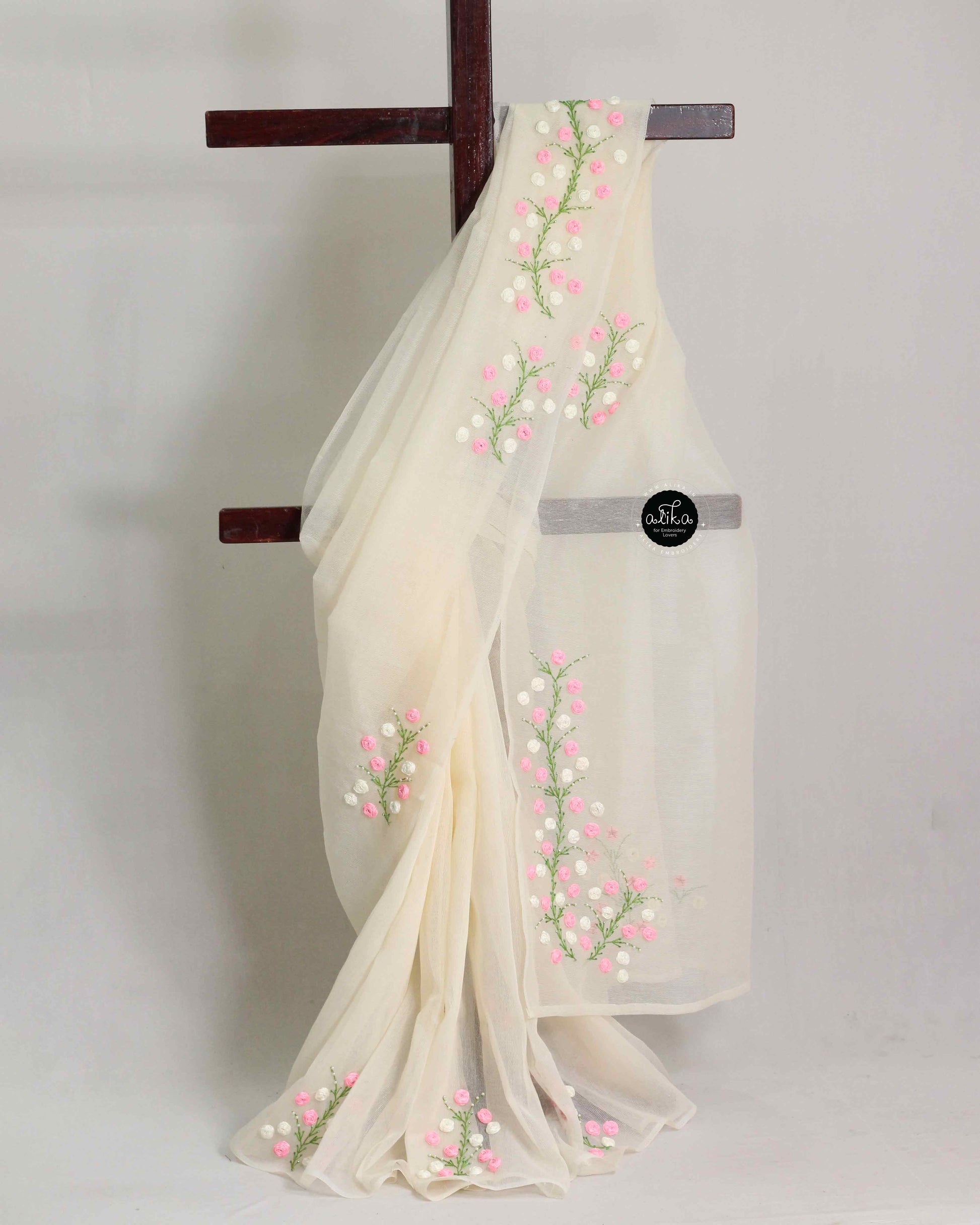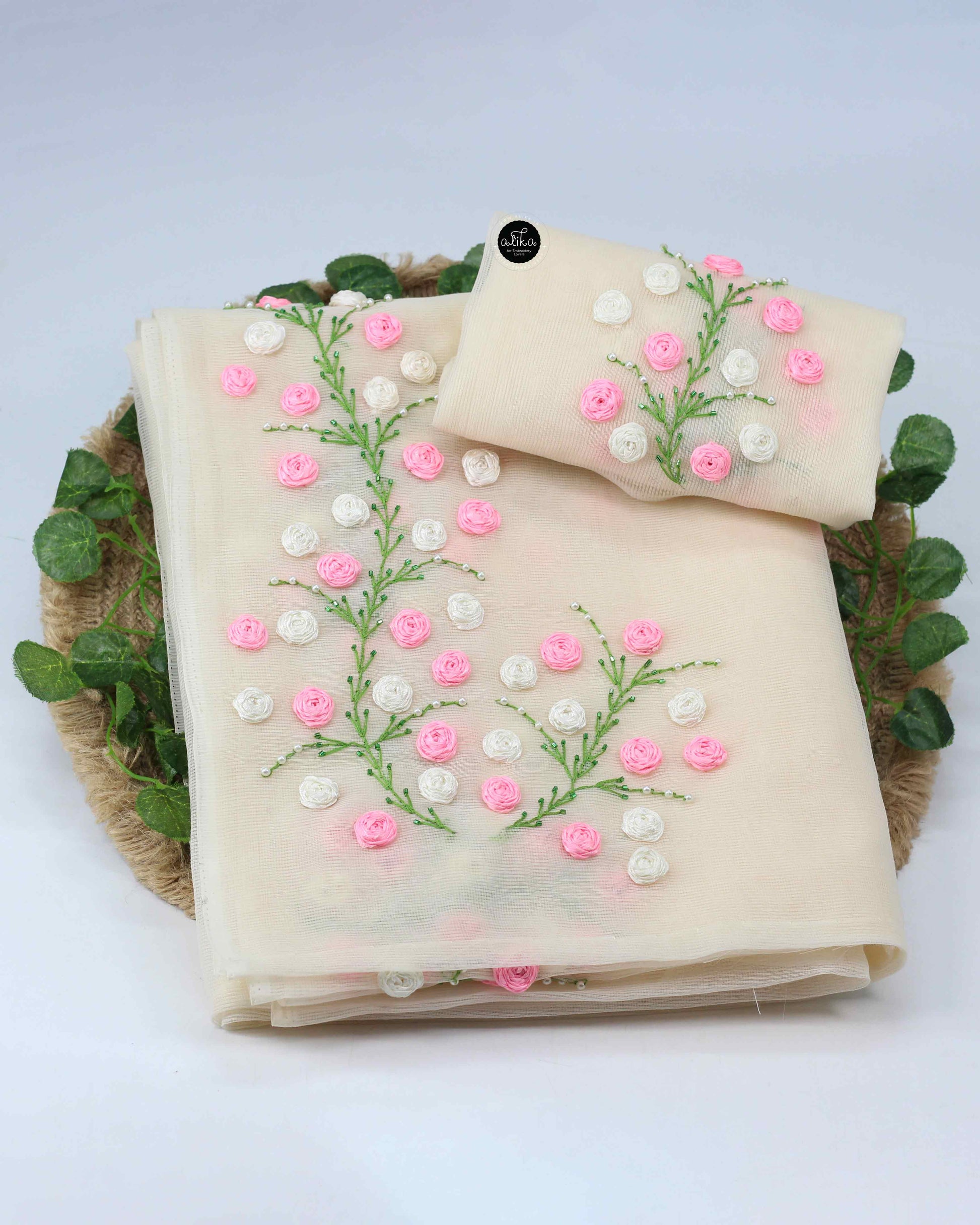 Cream Kota Saree with Floral Ribbon & Bead Work – Luxury Designer Wear