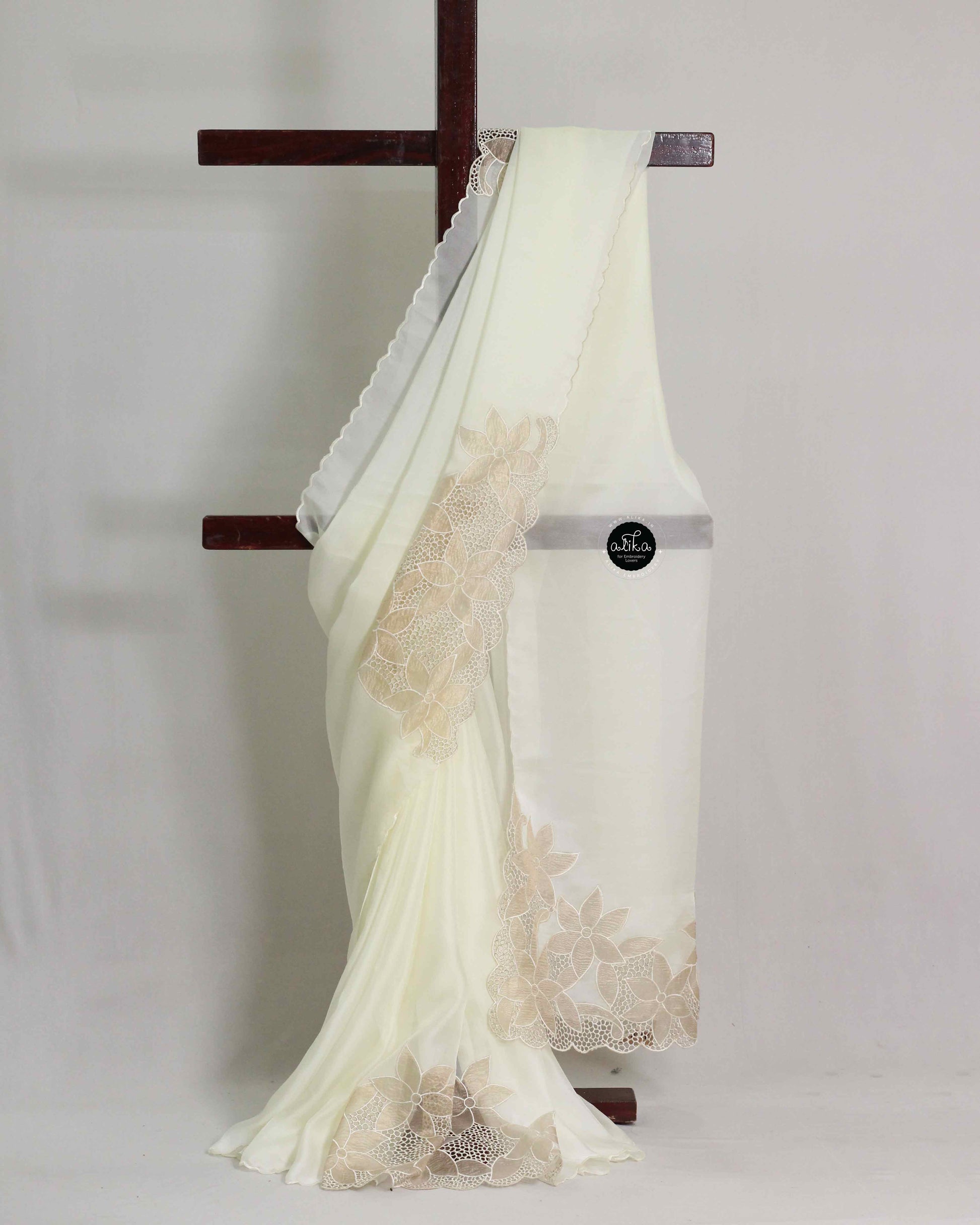 This cream organza saree features delicate golden cutwork embroidery. The fabric is lightweight and sheer with a soft, elegant texture. Suitable for festive occasions, formal events, and gifting.