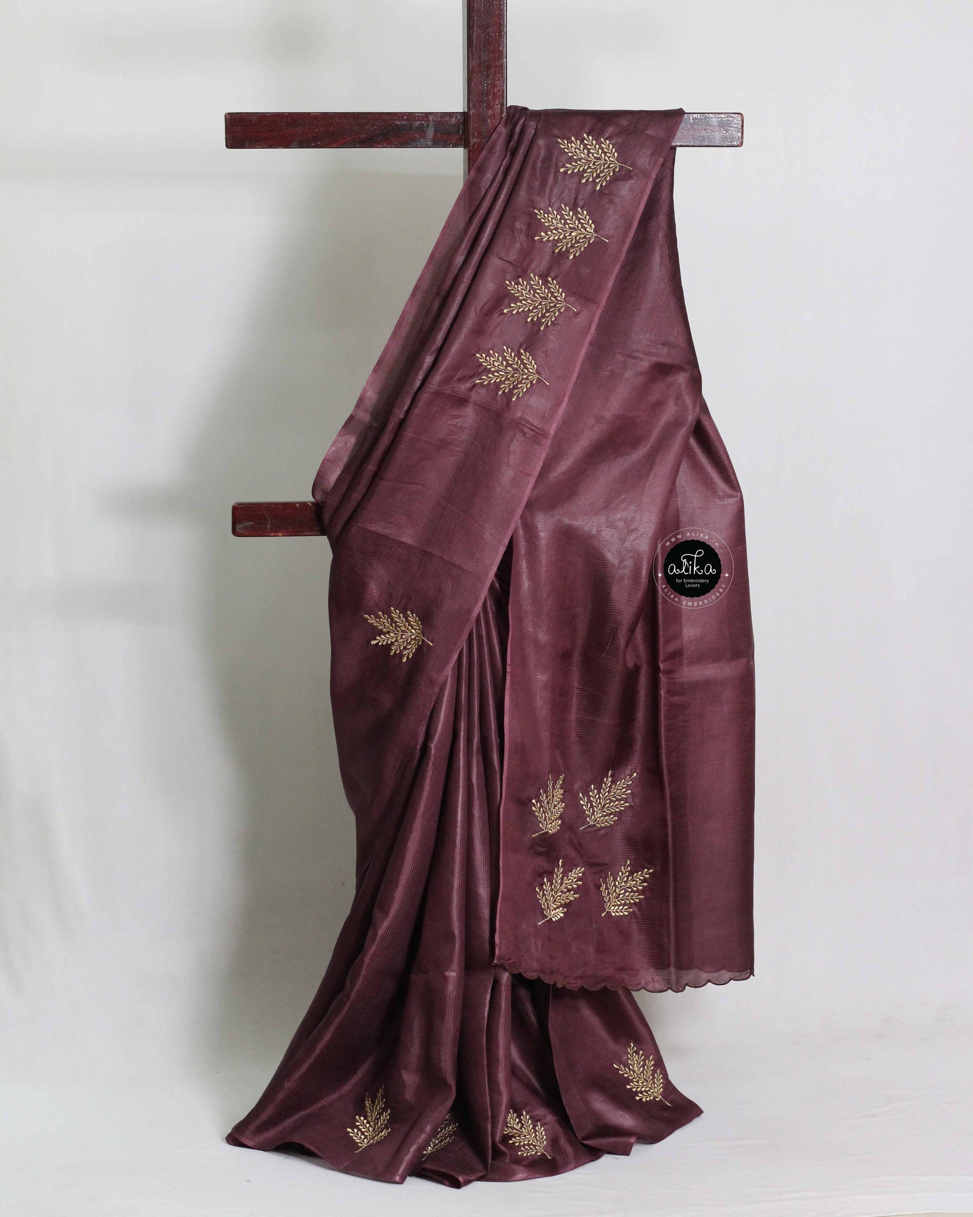 Dark Coffee Semi Tussar Saree with Floral Machine Embroidery