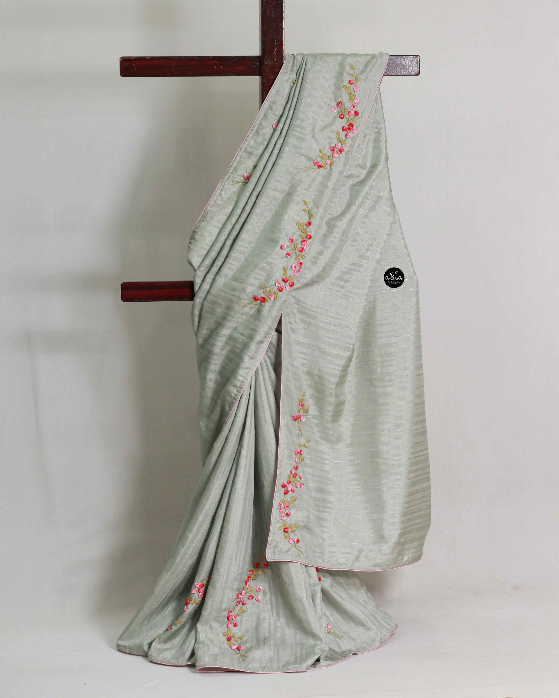 Green Tinted Gray Semi Silk Saree with Floral Hand Embroidery – Elegant Festive Wear