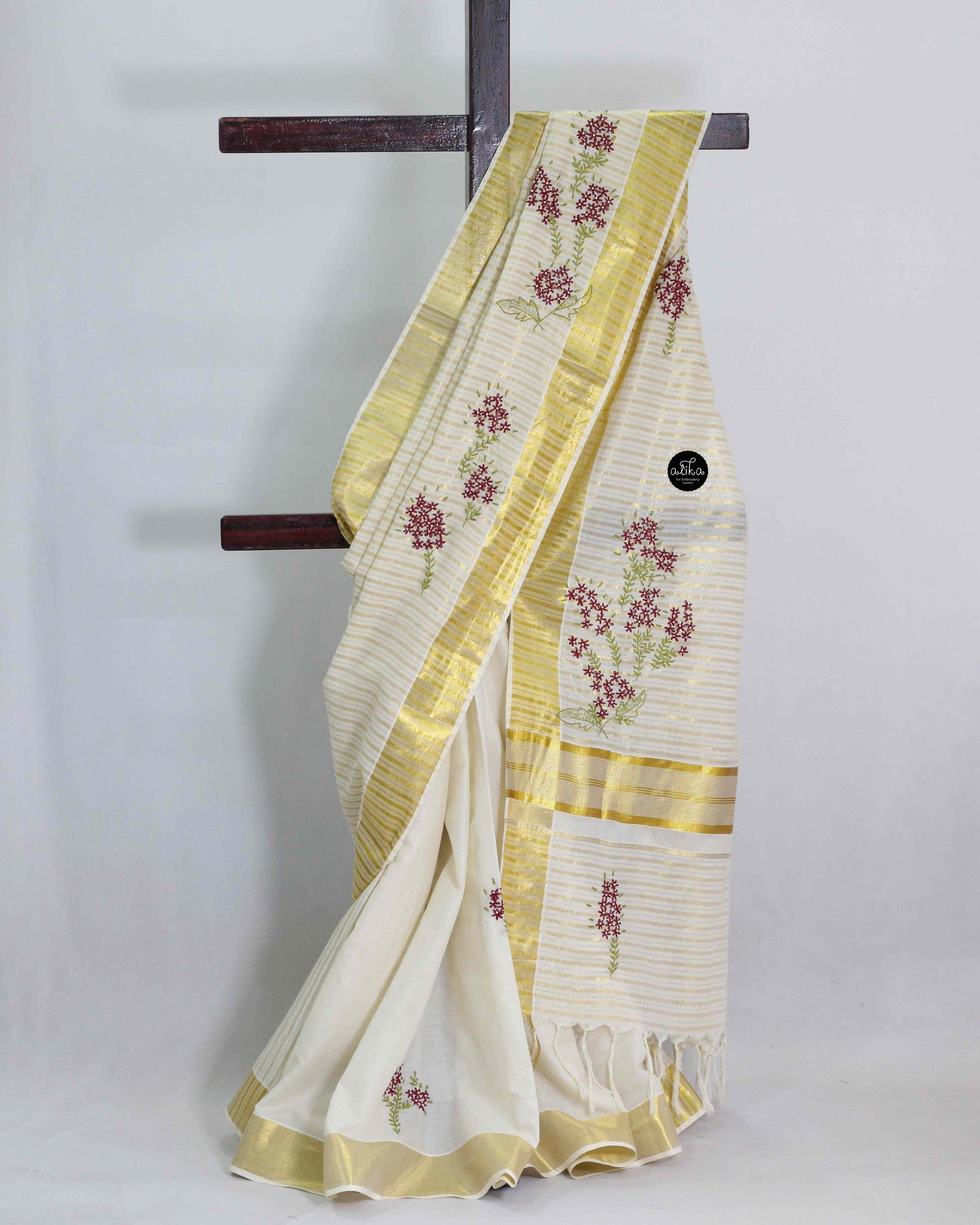 Kerala Cotton Saree with Lazy Daisy and Bead Embroidery