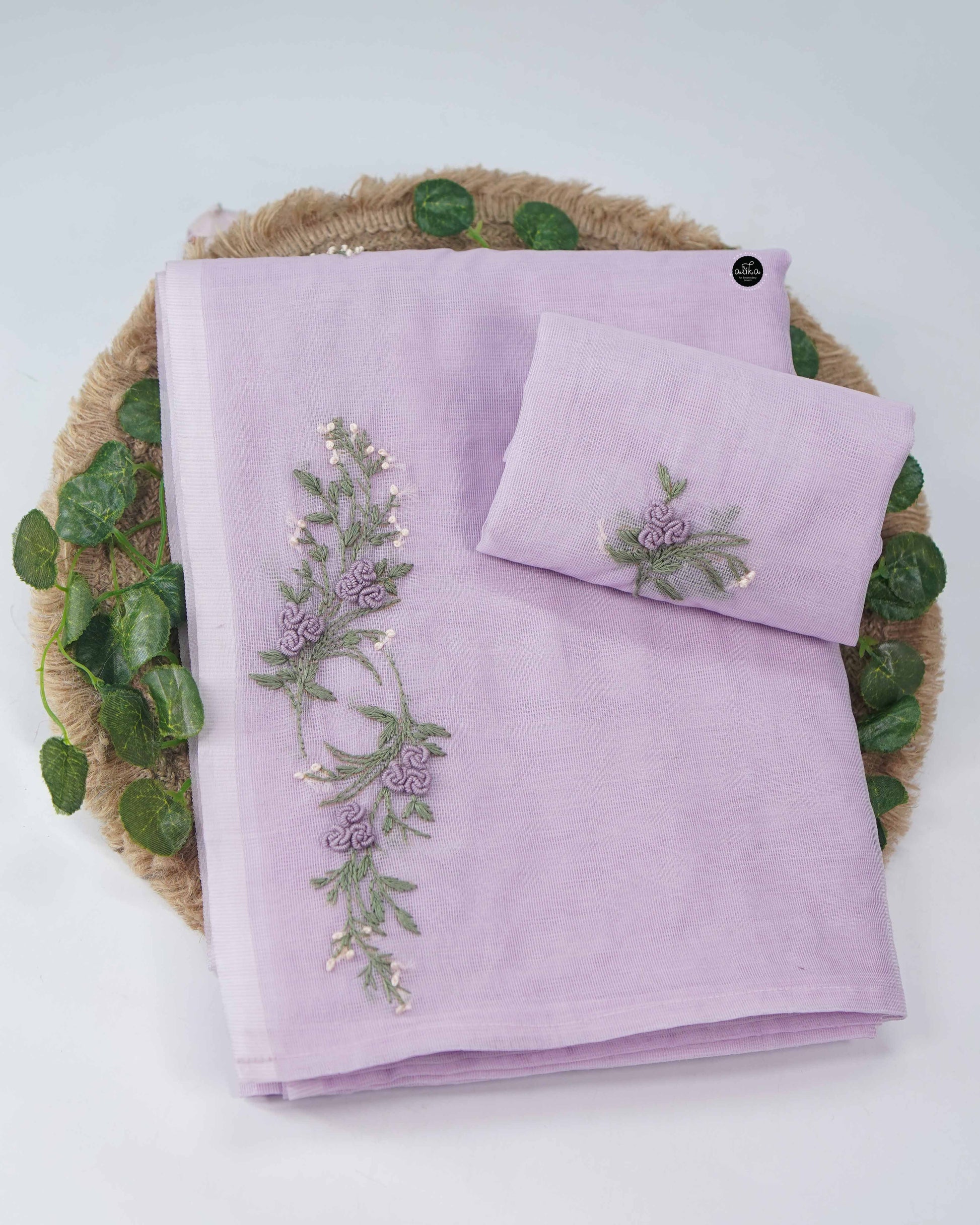 The saree is adorned with delicate floral hand embroidery, celebrating skilled craftsmanship and slow fashion values. Each embroidered motif reflects artisanal detail, making every piece subtly unique. The soothing lavender shade adds a soft, luxurious charm—perfect for women who appreciate understated sophistication.