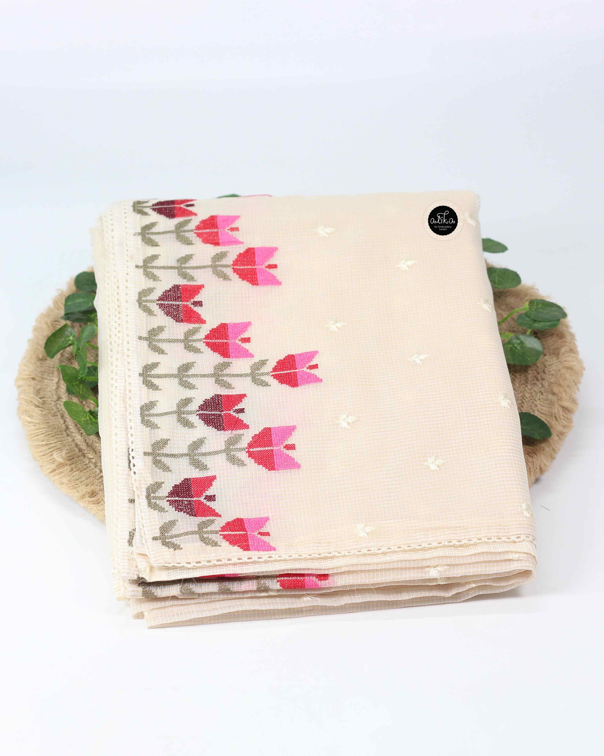 This light beige saree is made from lightweight Kota fabric. It features neat machine embroidery that adds subtle detail. Suitable for festive wear, office functions, and small gatherings.