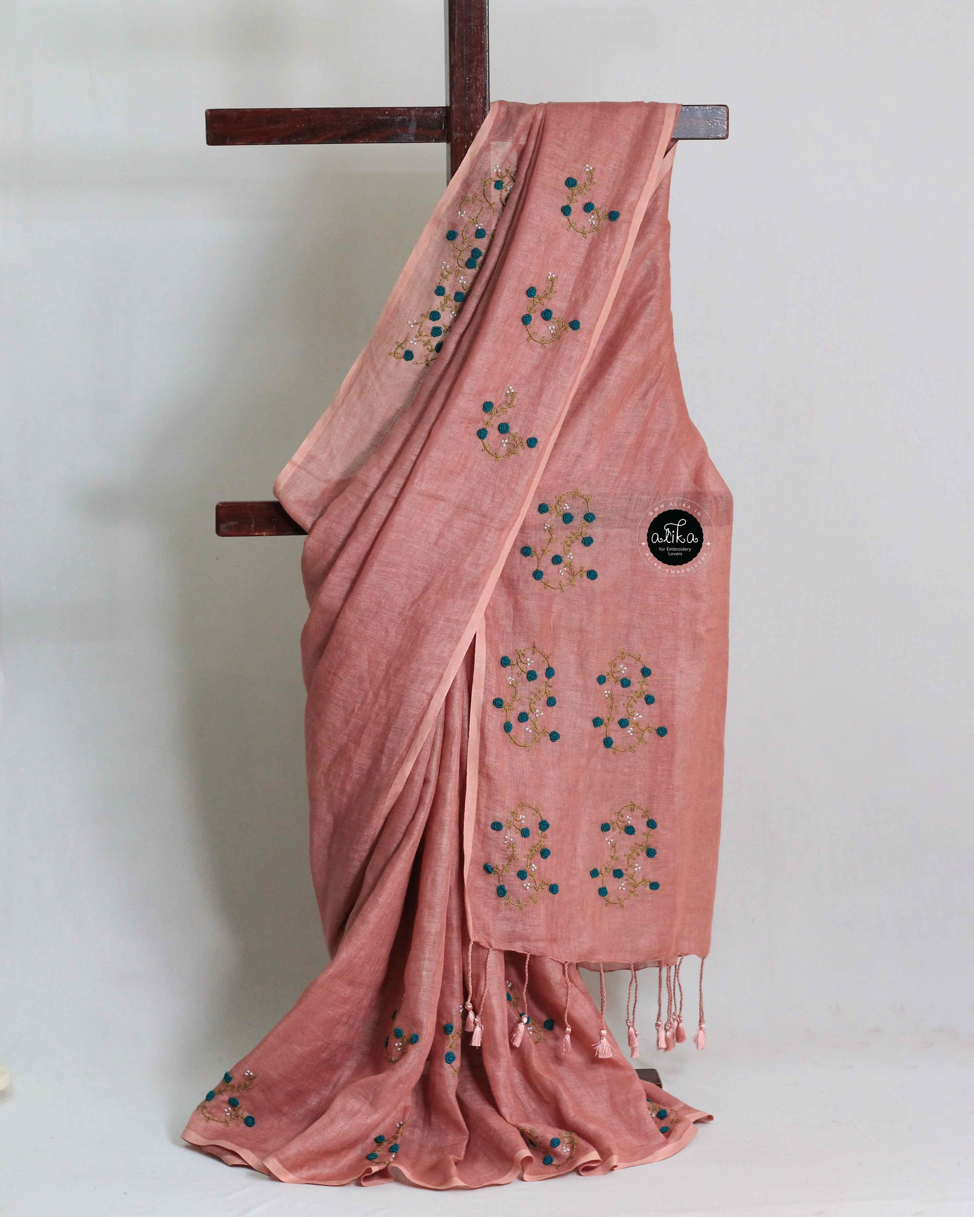 Light Chocolate Brown Pure Linen Saree with Floral Hand Embroidery