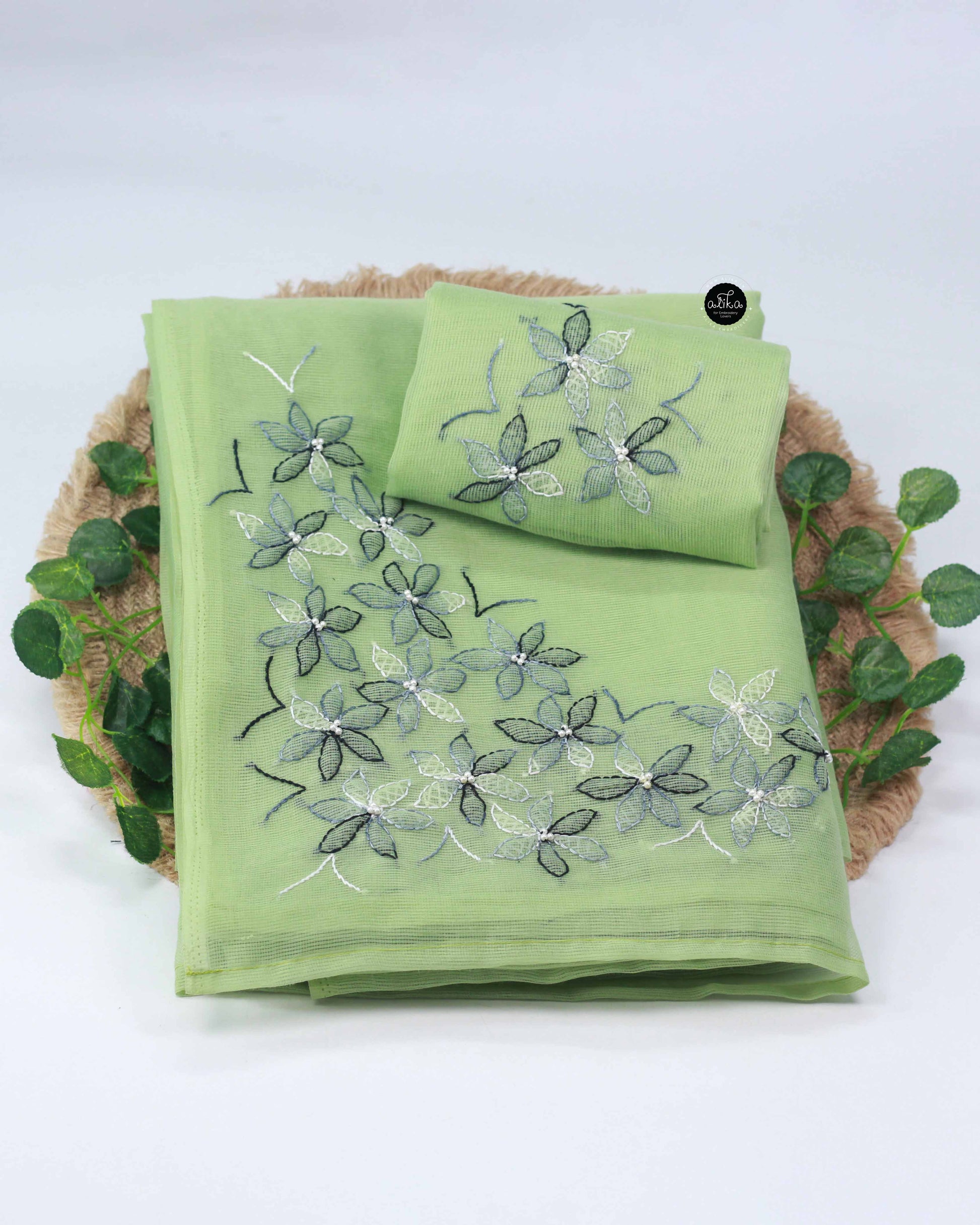 Light Green Kota Saree with Floral Shadow Work Embroidery