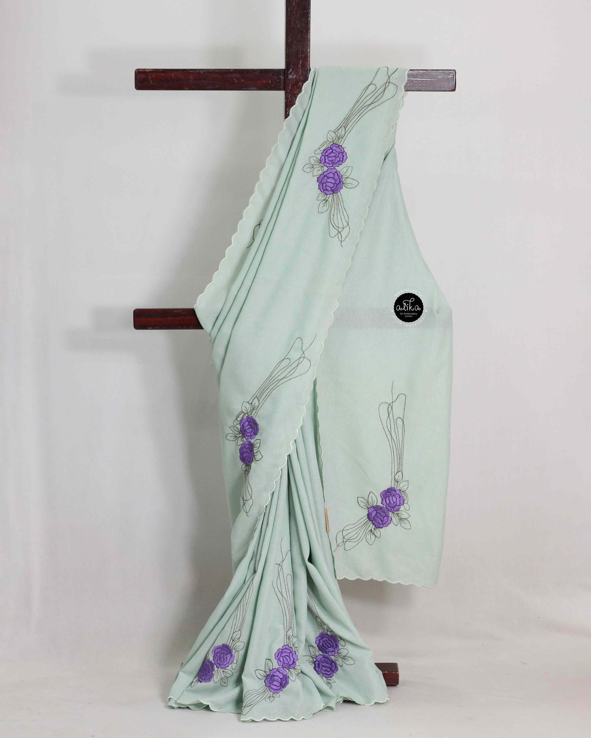 LIGHT GREEN SOFT SILK SAREE WITH VIOLET FLORAL MACHINE EMBROIDERY