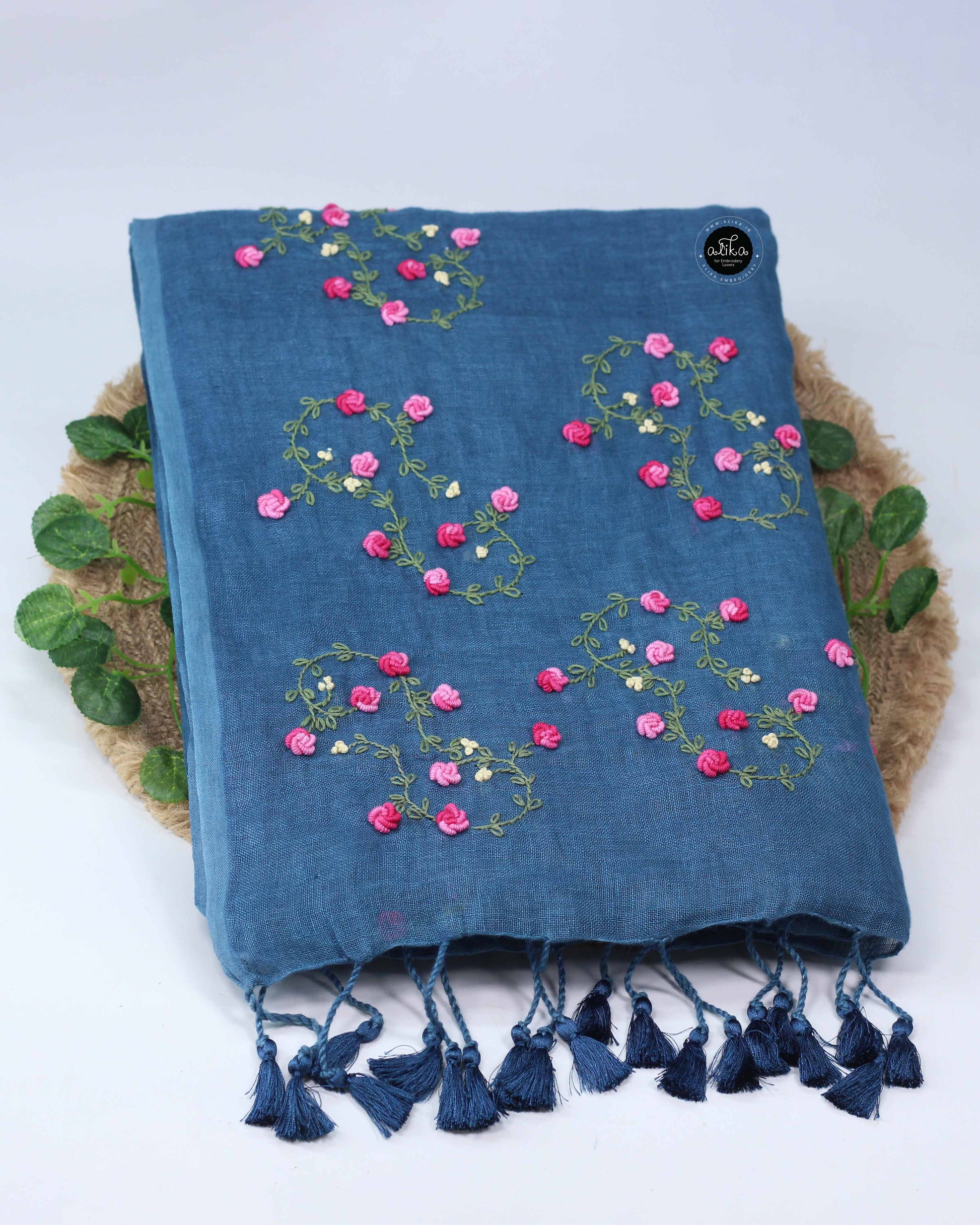 This light navy blue pure linen saree features fine floral hand embroidery. The fabric is breathable with a natural linen texture, making it suitable for office wear, festive occasions, and gifting.