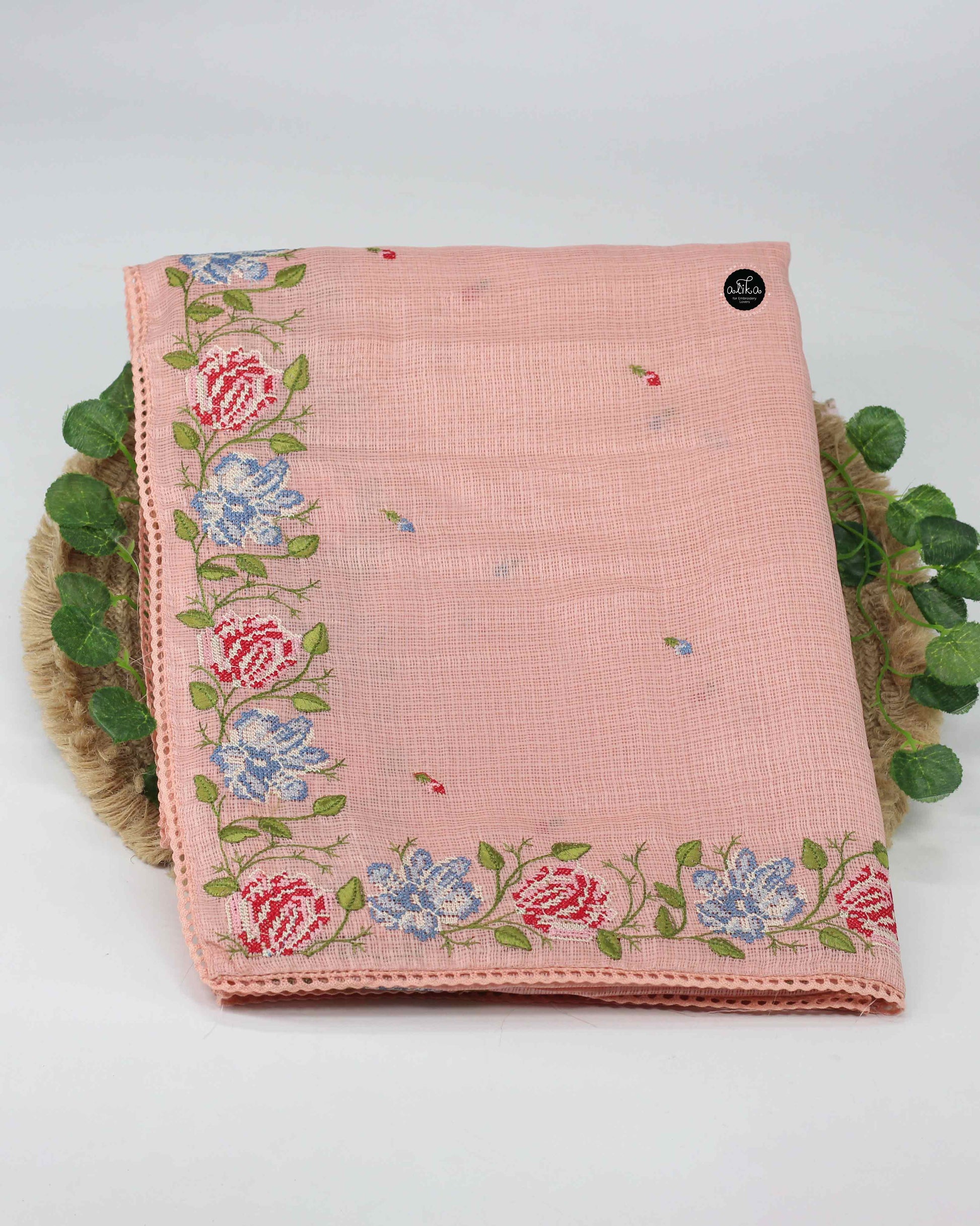 Light Orange Silky Kota Saree with Floral Machine Embroidery & Lace Piping