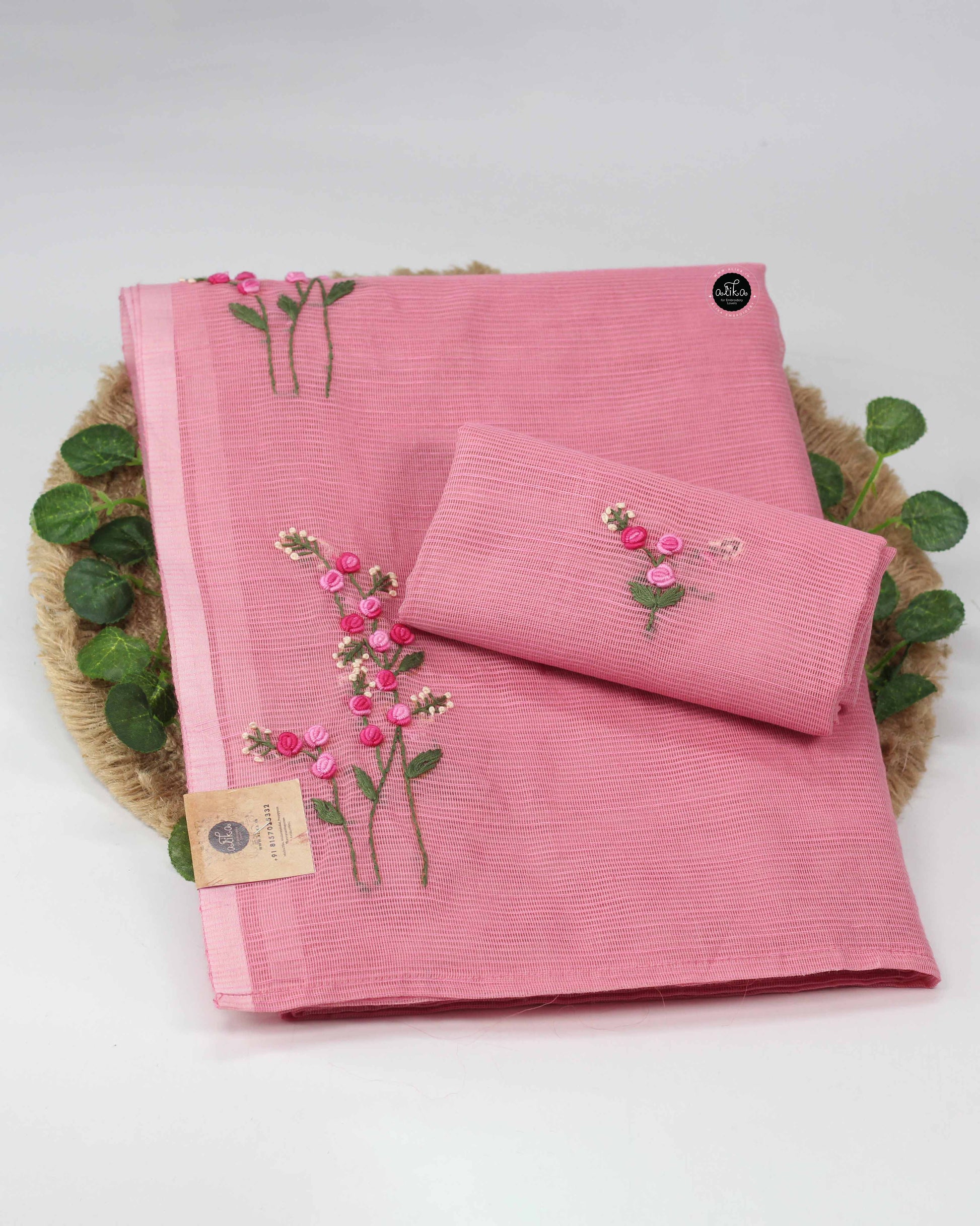This light pink Kota saree features delicate floral hand embroidery. The fabric is lightweight and airy with the characteristic Kota texture, making it suitable for festive wear, office use, and gifting.