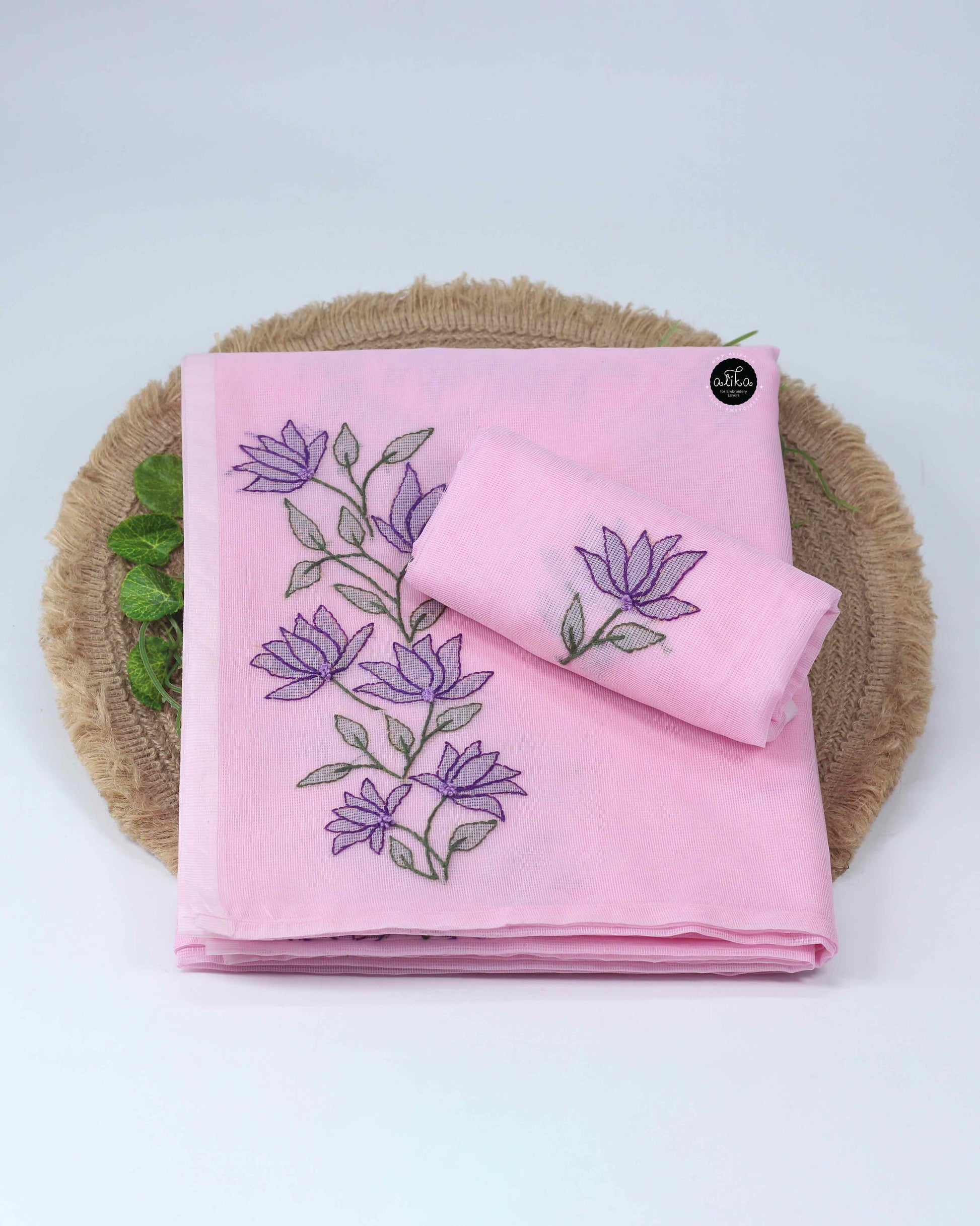 This saree is made from lightweight kota fabric in a soft light pink shade. It features floral shadow embroidery, making it suitable for festive wear, daytime functions, or gifting.