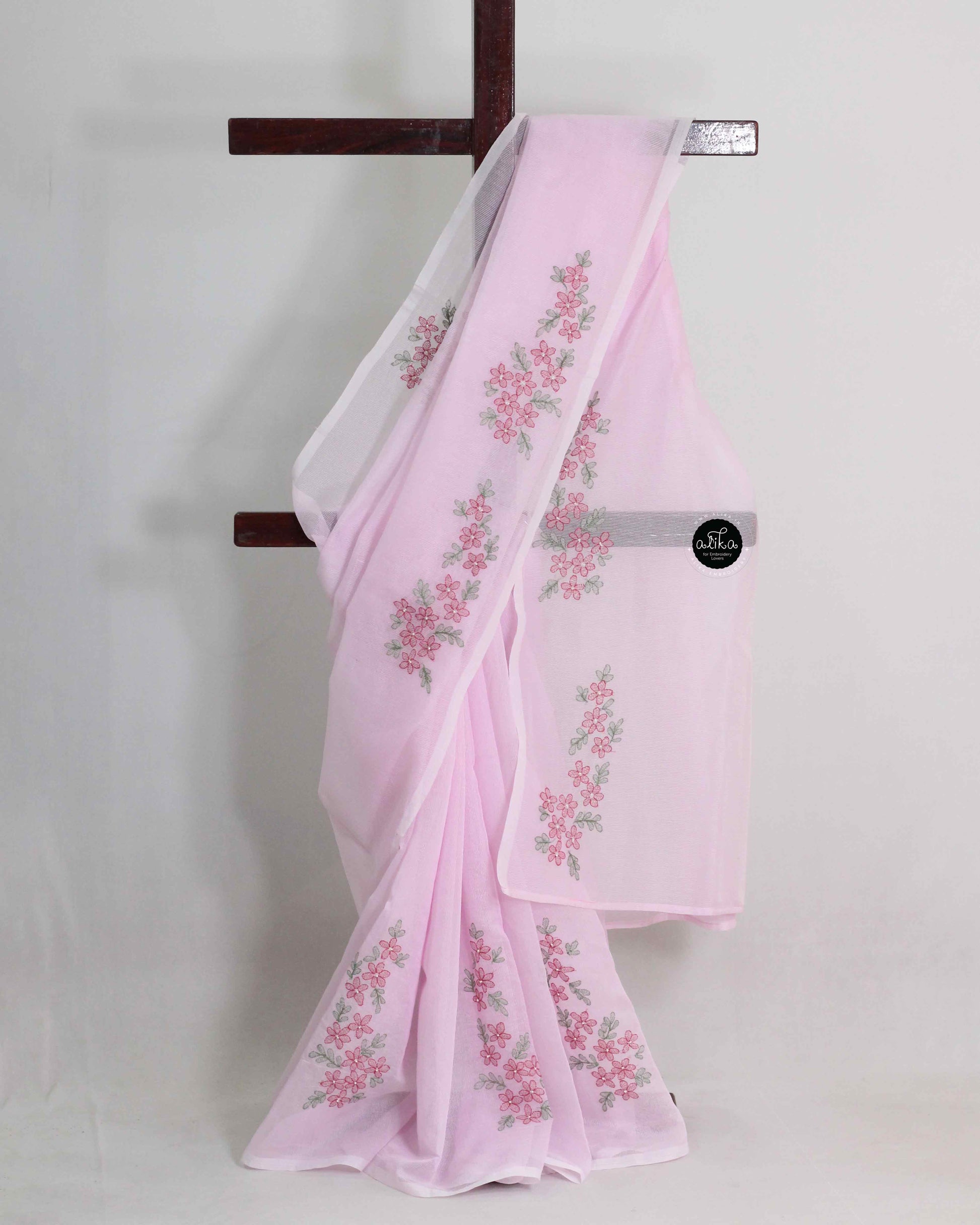 Light Pink Kota Saree with Floral Shadow Embroidery and Bead Work
