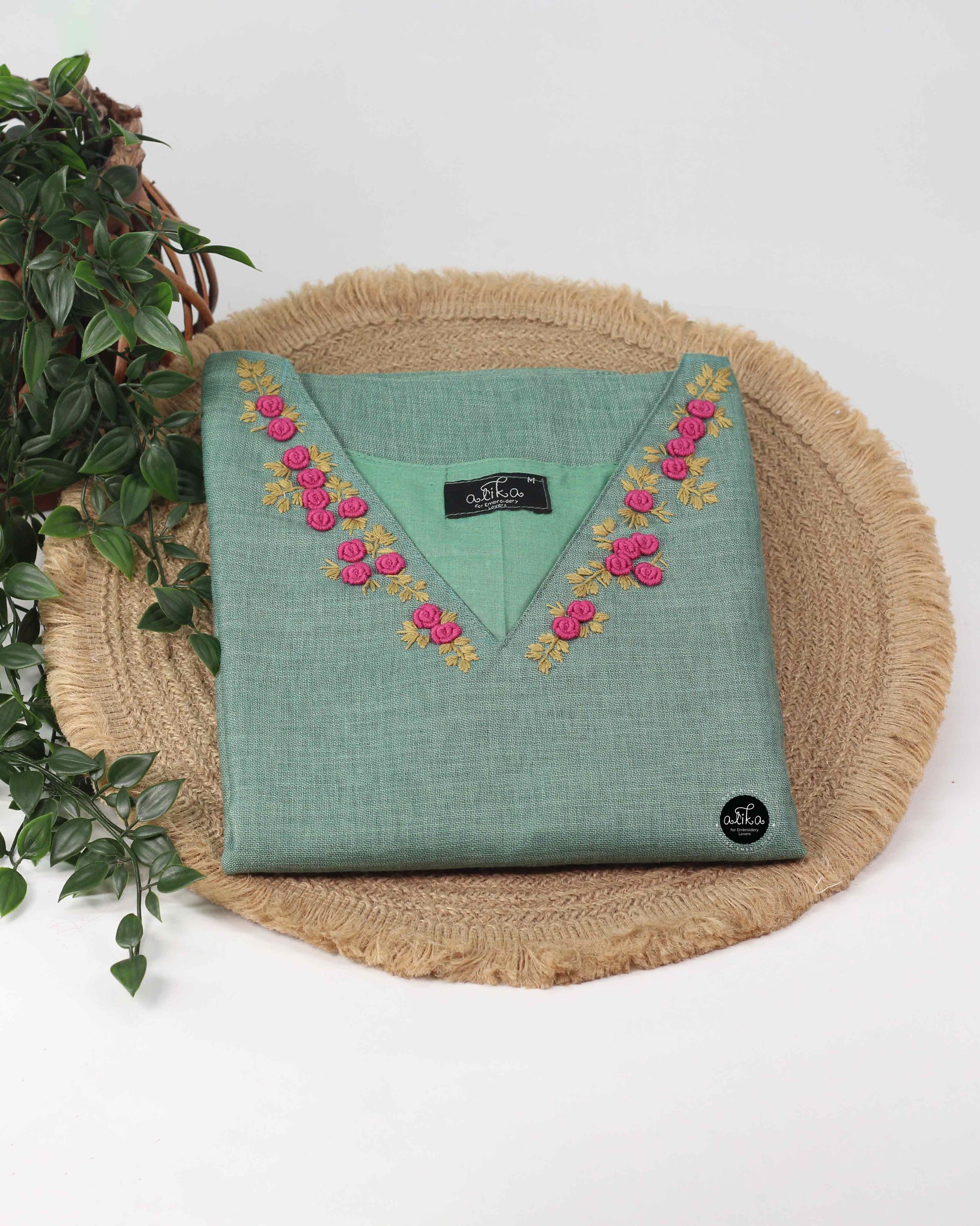Mint Green Semi-Linen Stitched Kurti with Floral Hand Embroidery on Neckline & Sleeves