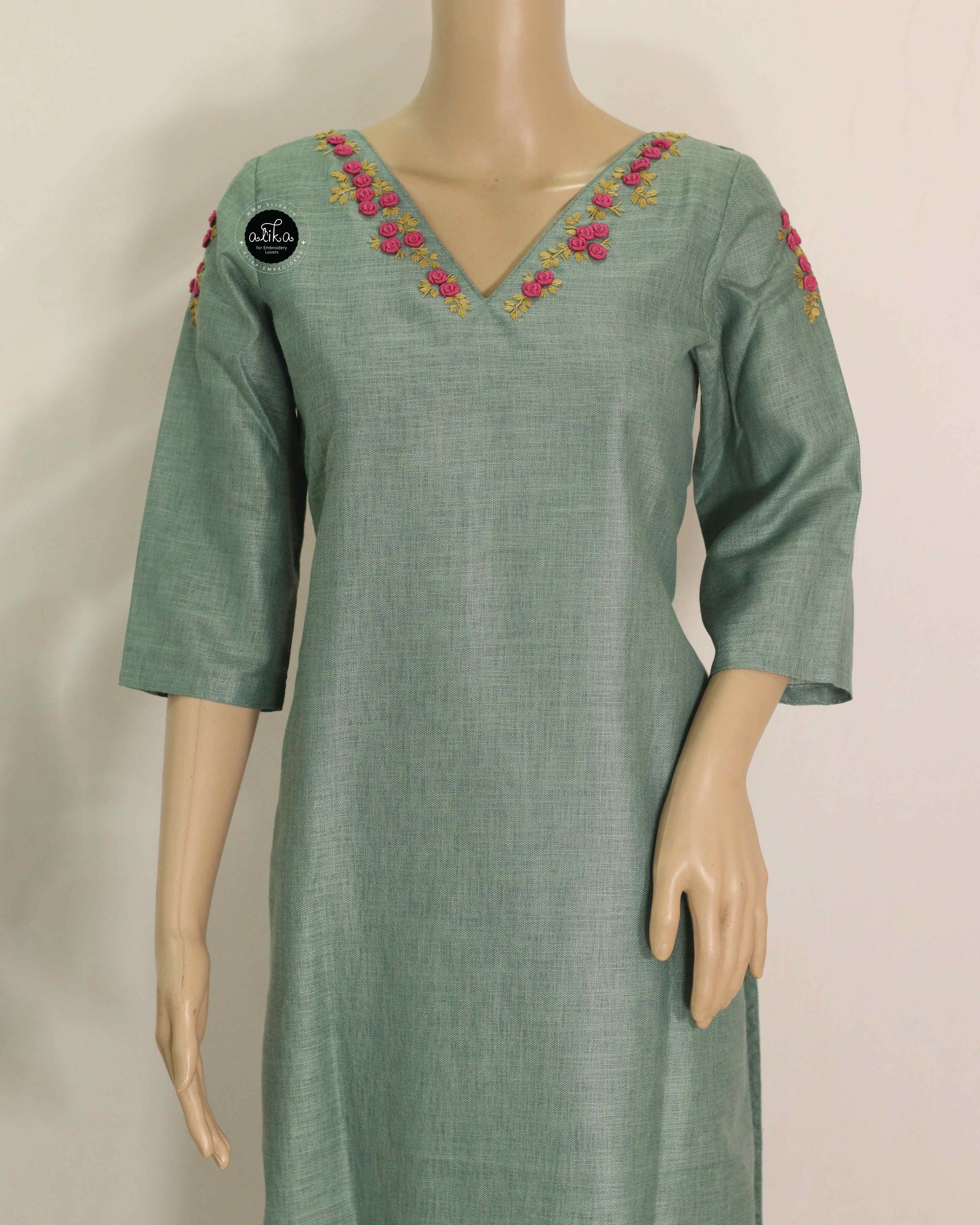 This stitched kurti is made from semi-linen fabric in a soft mint green shade. It features fine floral hand embroidery on the neckline and top of the sleeves. Ideal for office wear, casual outings, festive occasions, or gifting.