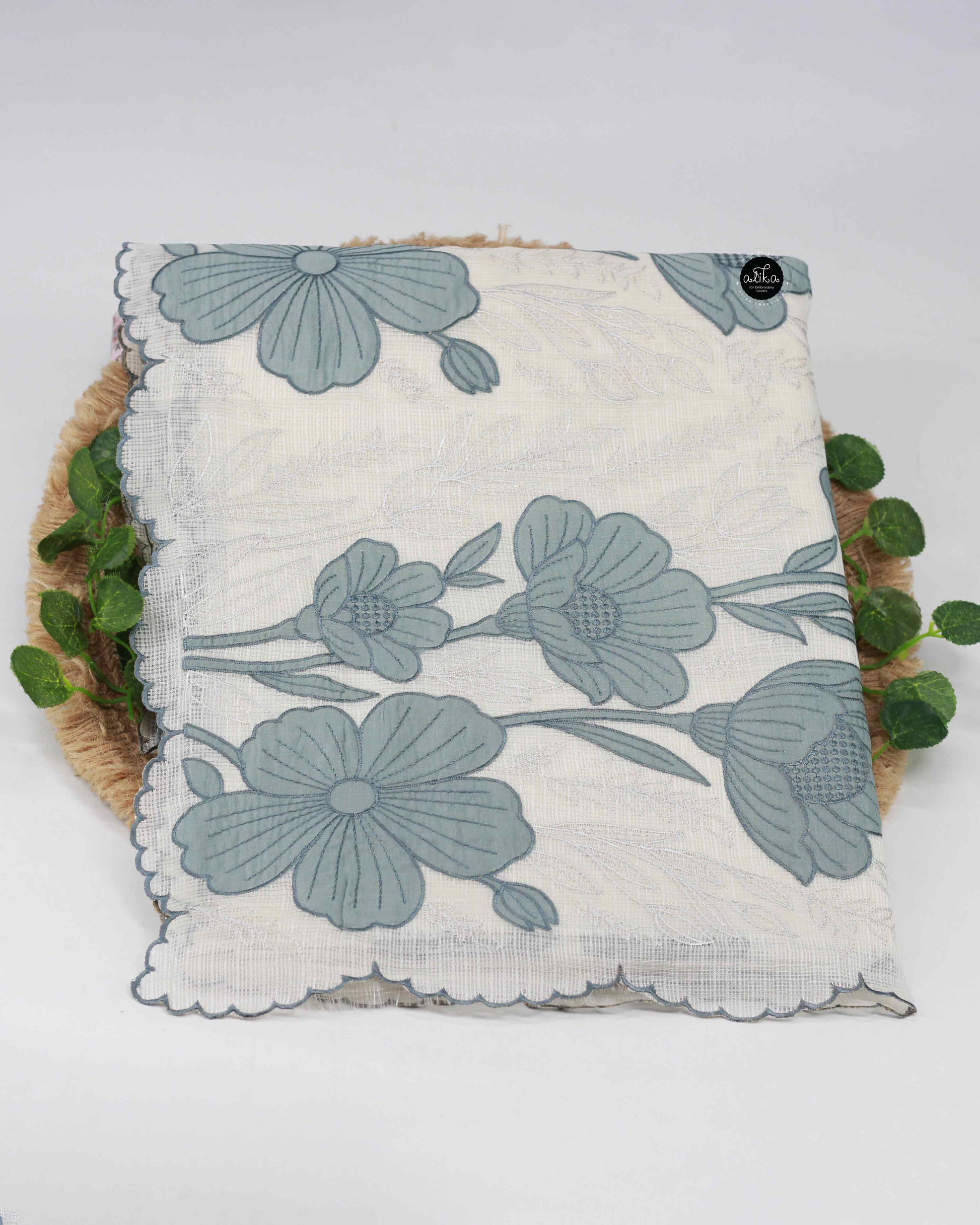 Off-White Kota Saree with Gray Floral Appliqué – Elegant Designer Wear