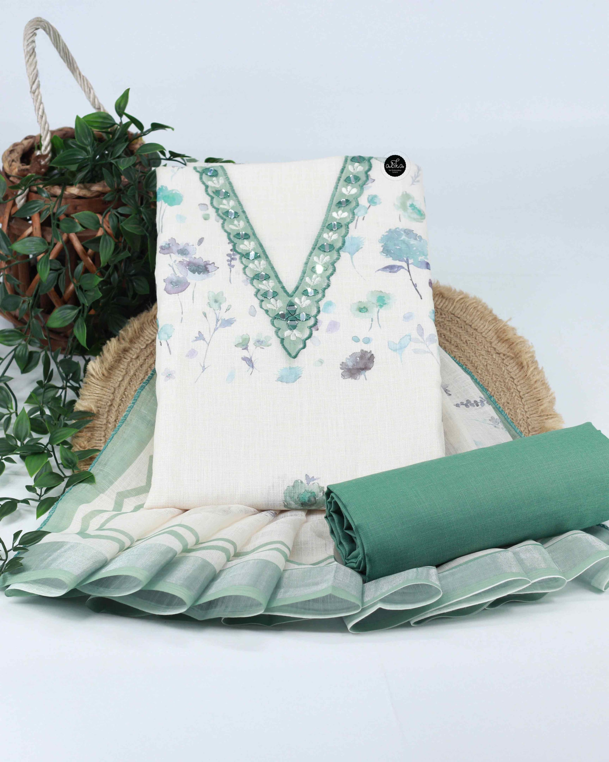 Bring timeless elegance to your ethnic wardrobe with this Off-White Semi-Tissue Unstitched Salwar Set from Alika Fashion Store. Designed for women who love delicate artistry and luxury fabrics, this set features floral prints enhanced with subtle mirror work, creating a graceful, festive-ready look.