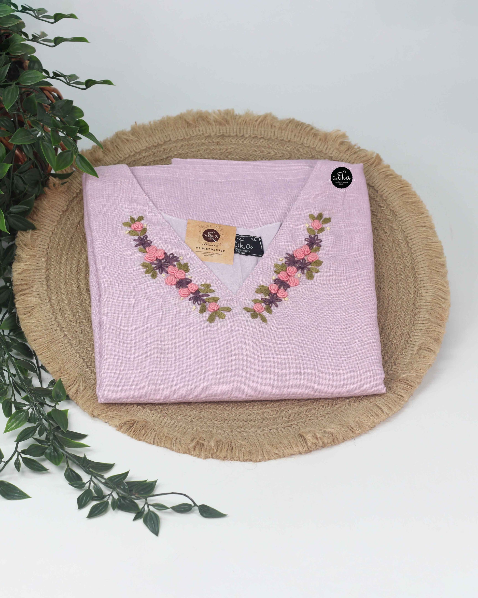 Pale Lavender Semi-Linen Stitched Kurta with Hand-Embroidered Floral Detailing – Elegant Festive & Ethnic Wear for Women
