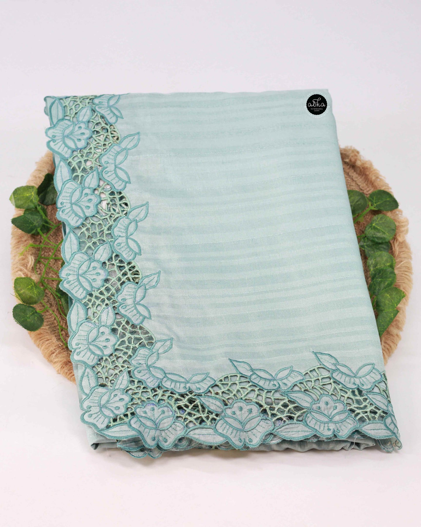 This elegant saree is crafted from premium semi silk fabric and adorned with intricate floral full border cutwork. The delicate pastel blue tone paired with detailed craftsmanship creates a refined and timeless look, making it an ideal choice for special occasions and festive gatherings.