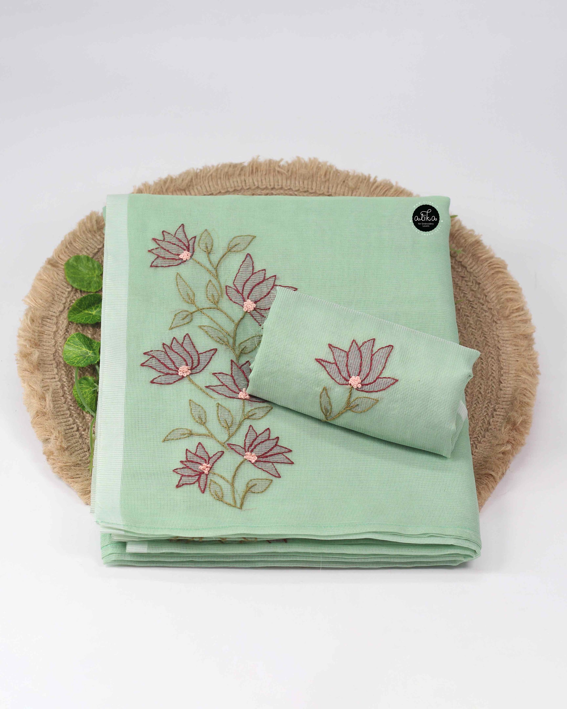 This saree is made from lightweight kota fabric in a soft pastel green shade. It features floral shadow work embroidery, making it suitable for festive events, casual occasions, or gifting.