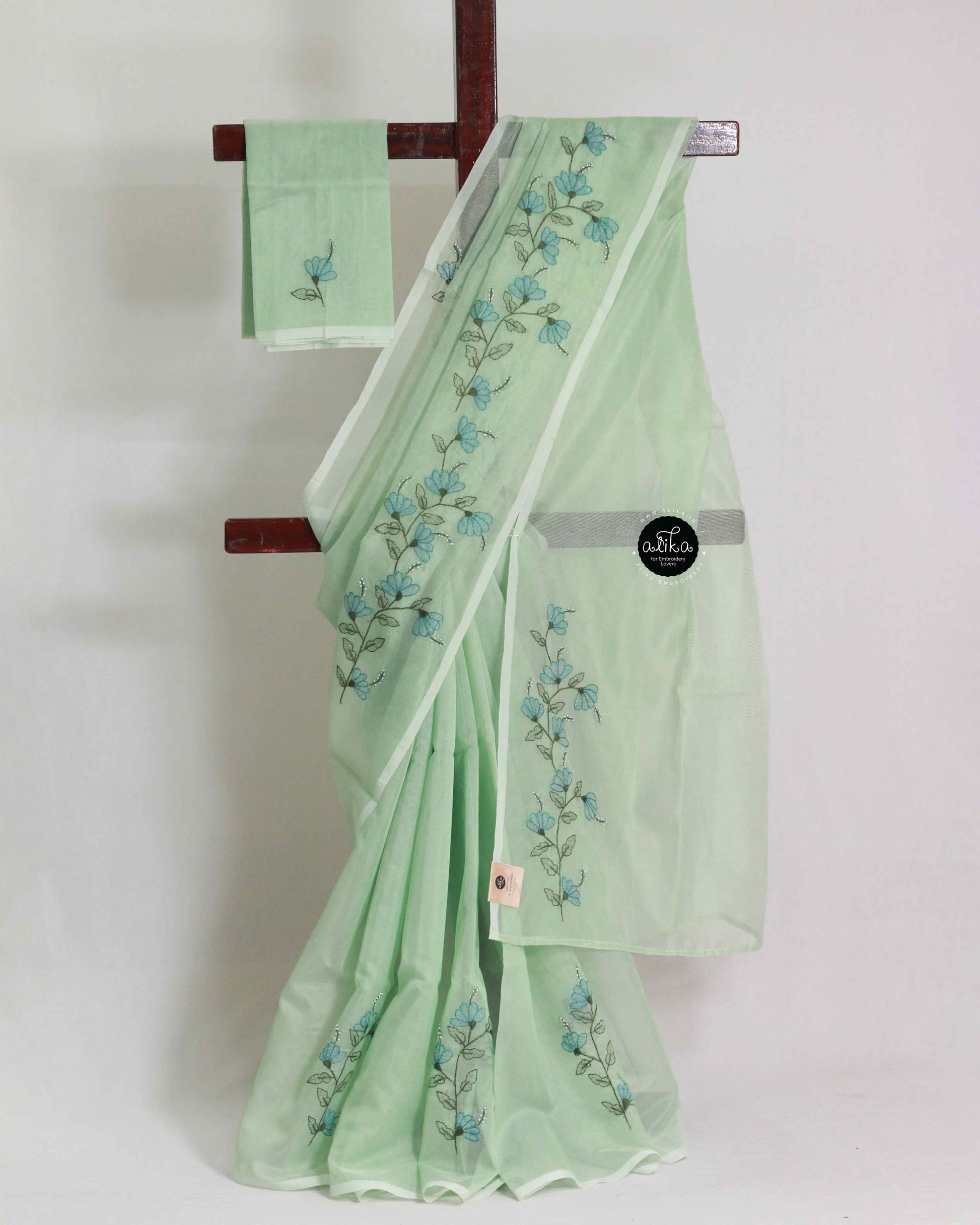 Pista Green Kota Saree with Floral Shadow and Bead Work