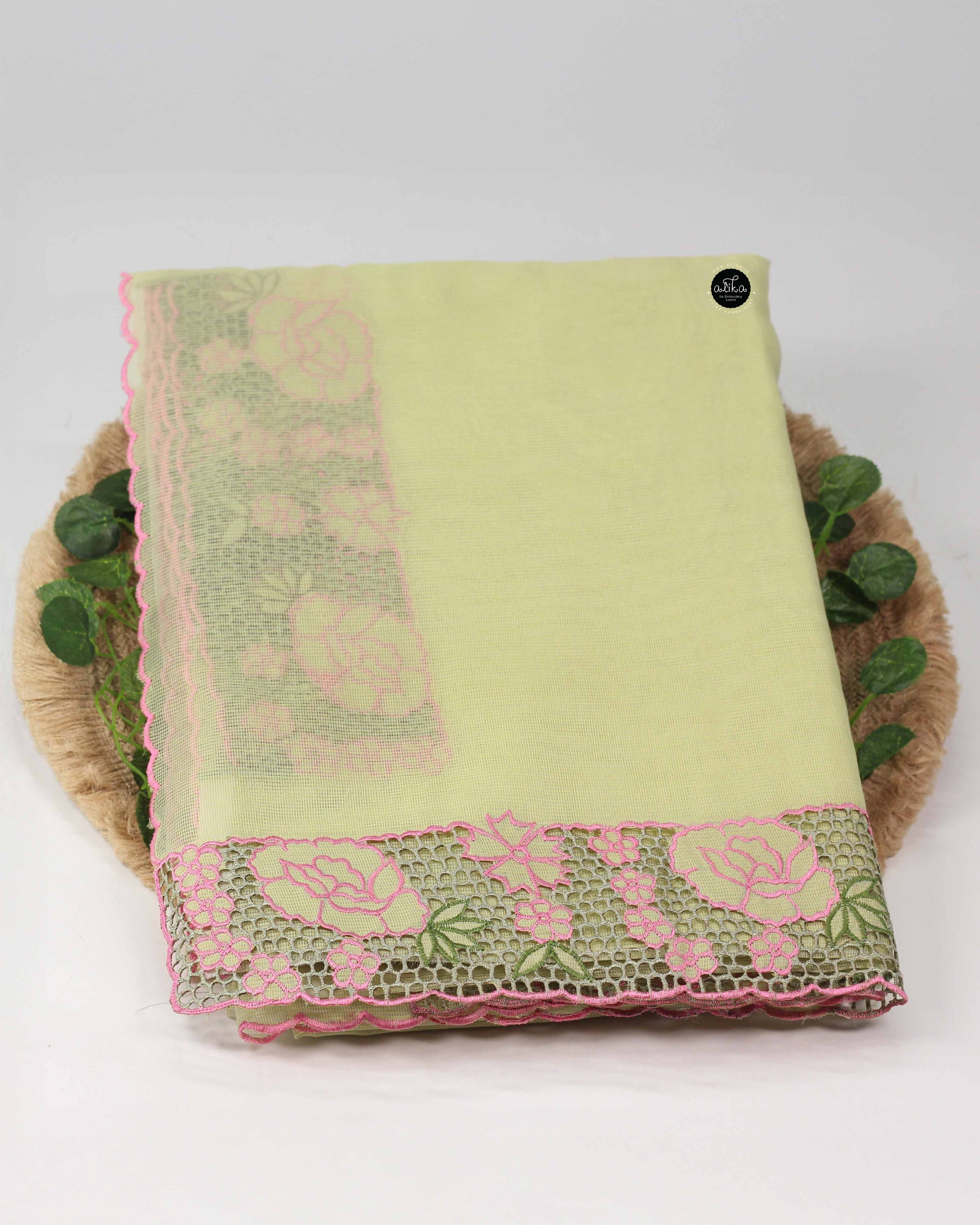This pista green Kota saree is crafted in lightweight Kota fabric and detailed with peach floral cutwork. The airy texture and neat cutwork make it suitable for festive wear, office use, and gifting.