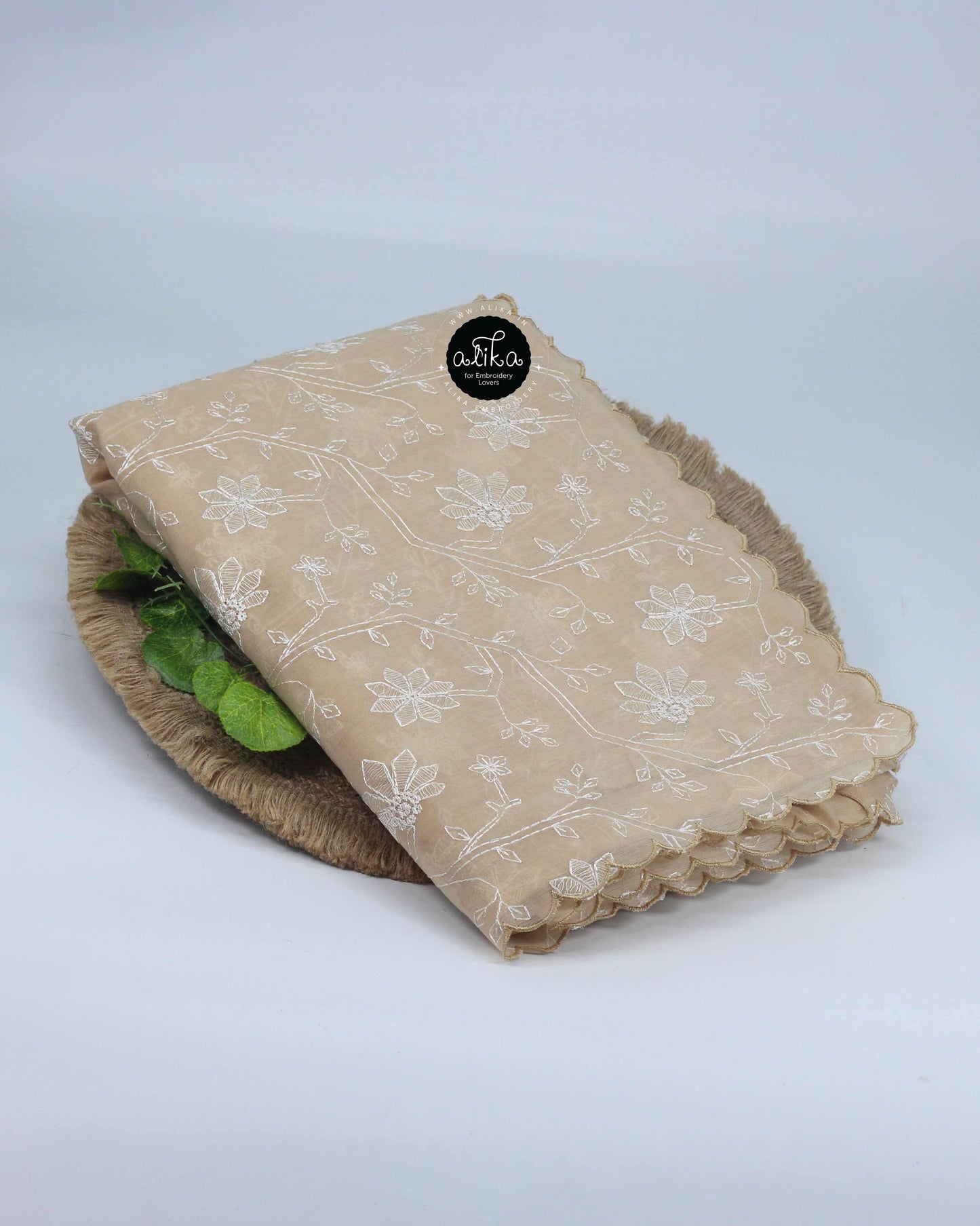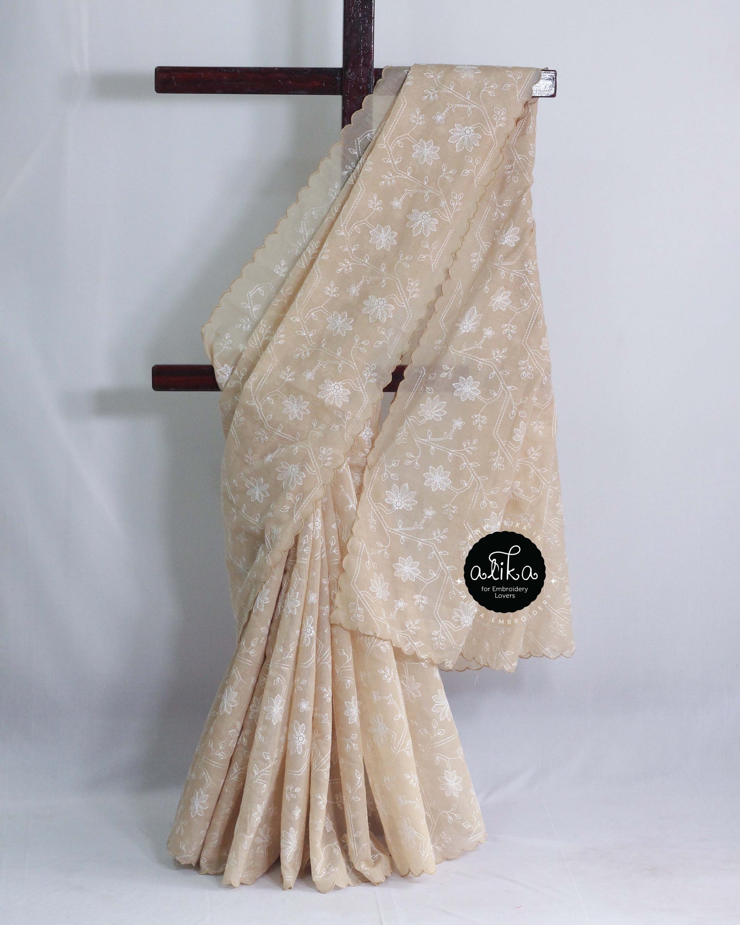 Intricately adorned with floral embroidery, the saree brings a soft, feminine aesthetic to a warm, neutral sandal tone that complements all skin tones. The highlight of the piece is its scalloped embroidered border, offering a sophisticated and stylish finish that enhances the overall look with artisanal charm.
