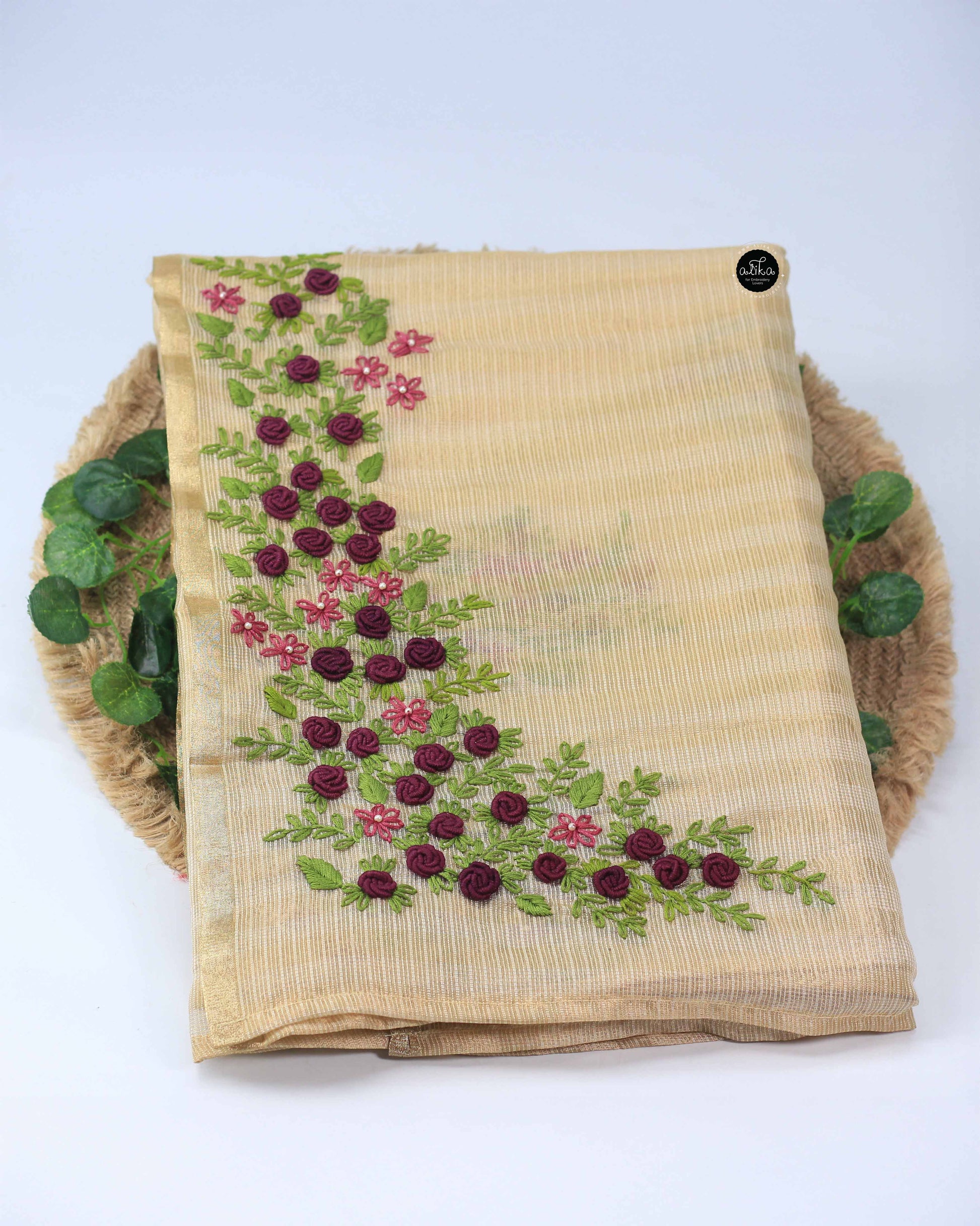This semi tissue saree is crafted in a lightweight fabric with a soft sheen and fine texture. It features floral hand embroidery that adds subtle detail and a traditional touch. Suitable for festive wear, office use, and gifting.