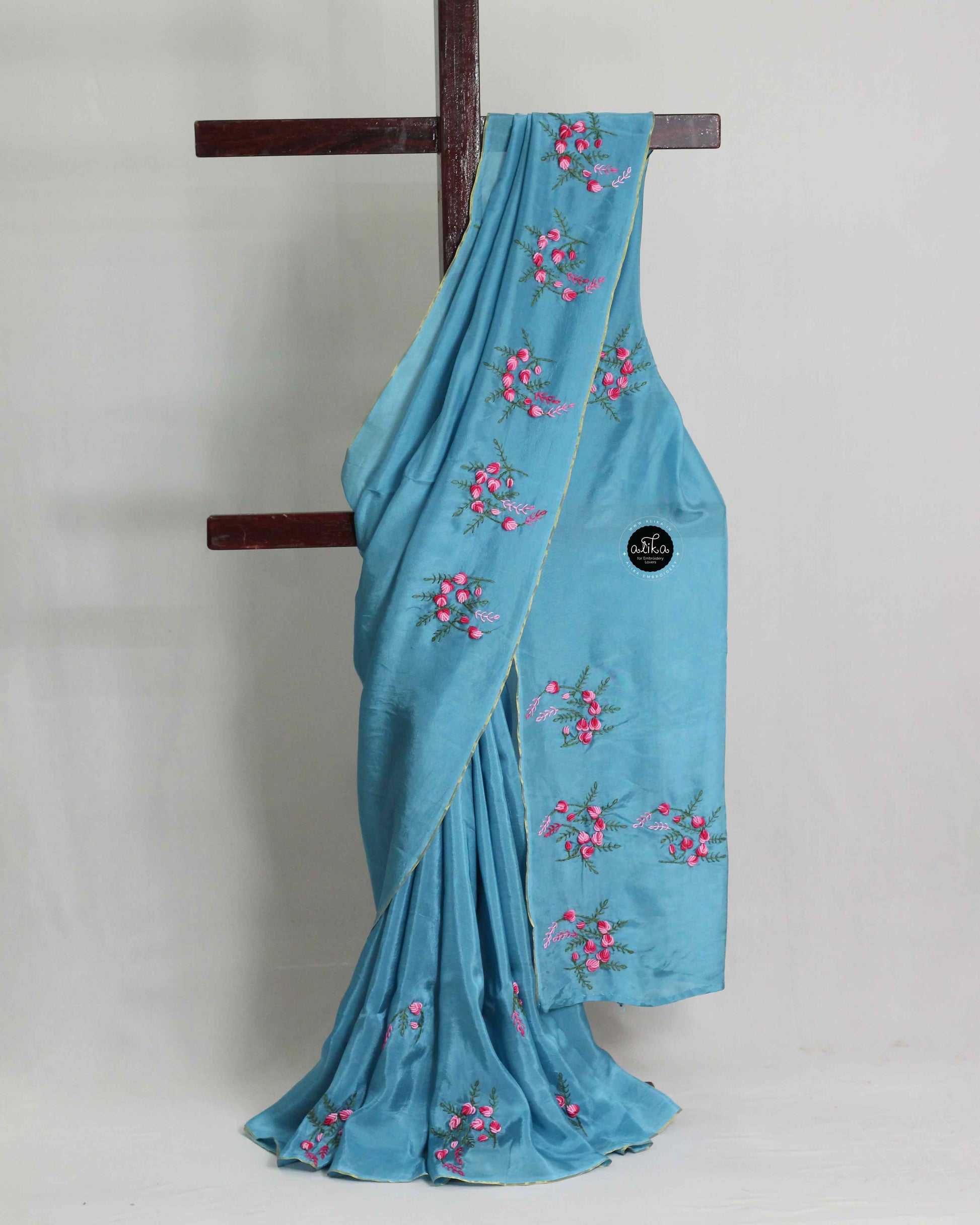 The soothing sky blue hue exudes sophistication and charm, making it an ideal choice for weddings, festive celebrations, receptions, and special occasions. The delicate floral embroidery enhances its artisanal appeal, creating a refined statement piece for your ethnic wardrobe.