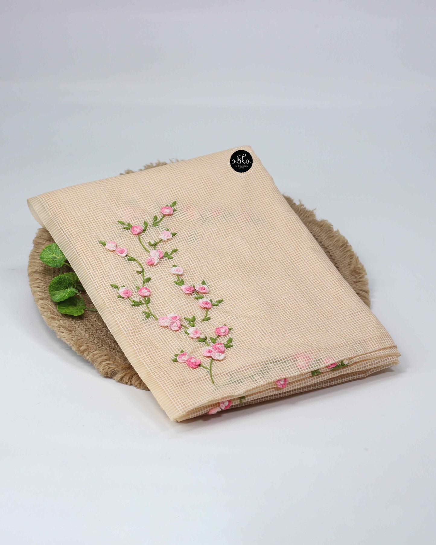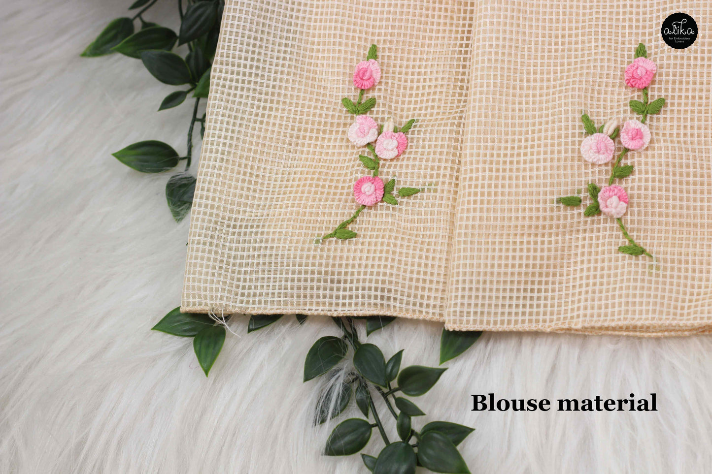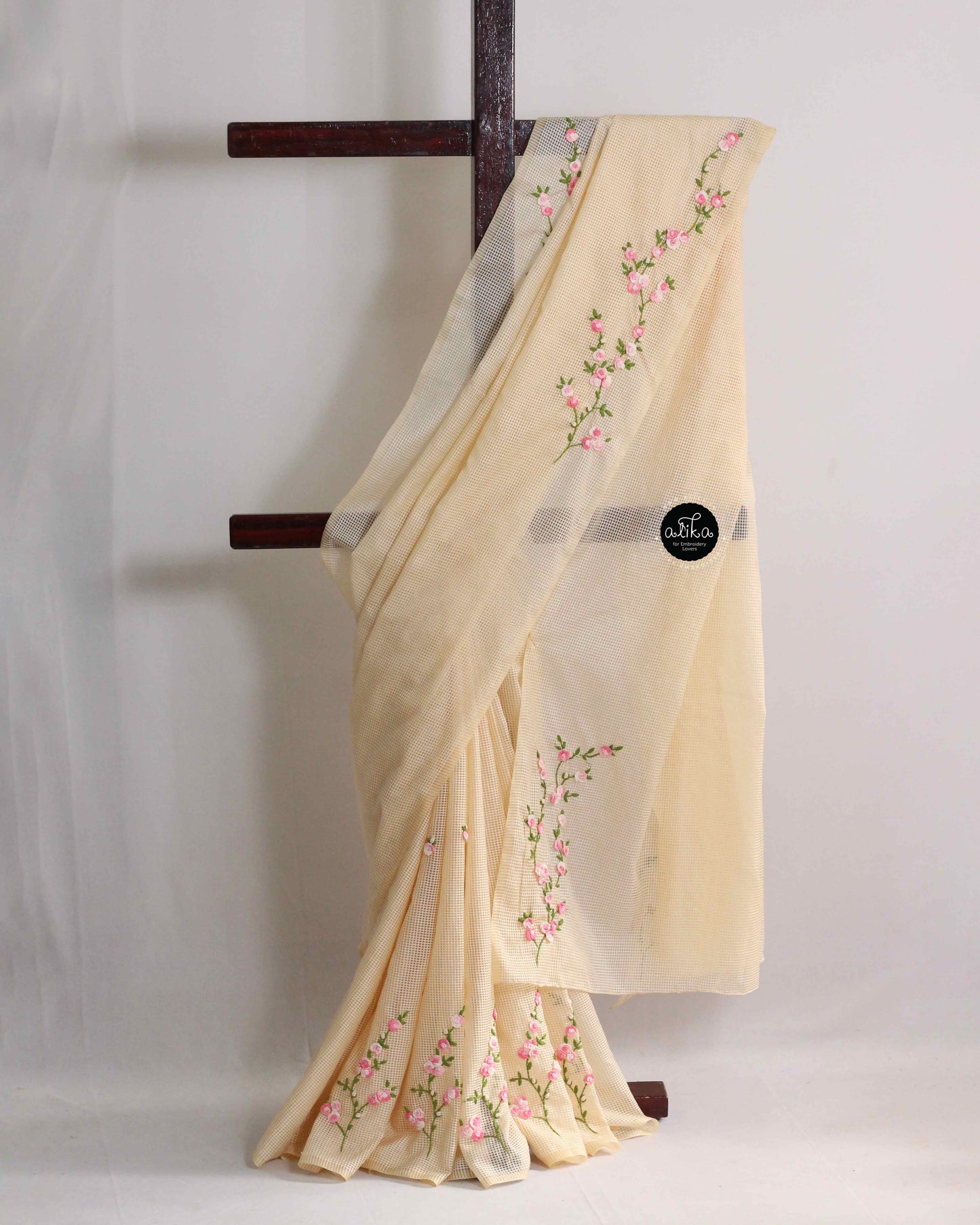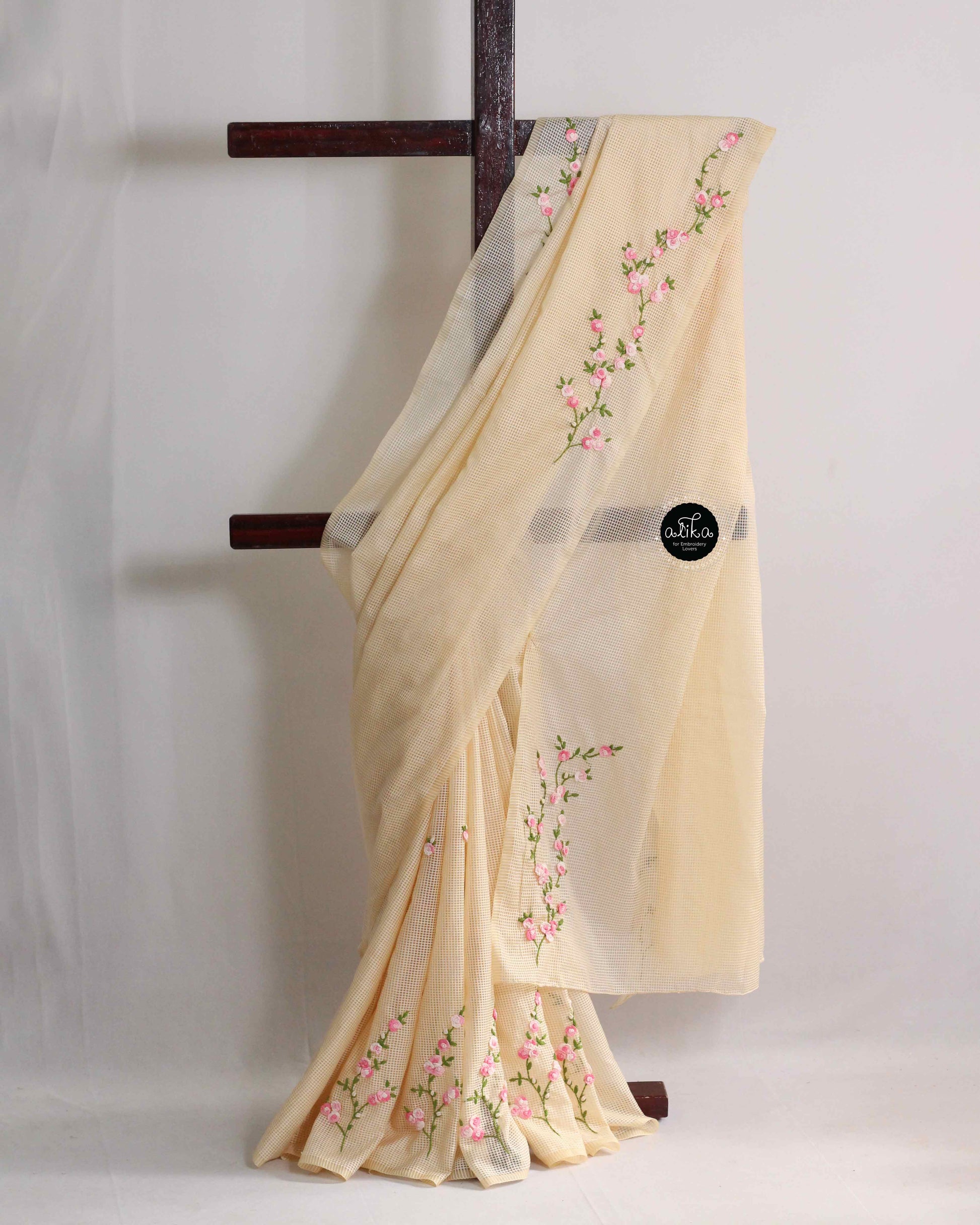 Vanilla Semi-Silk Saree with Floral Hand Embroidery – Graceful Artisan Drape by Alika Fashion Store