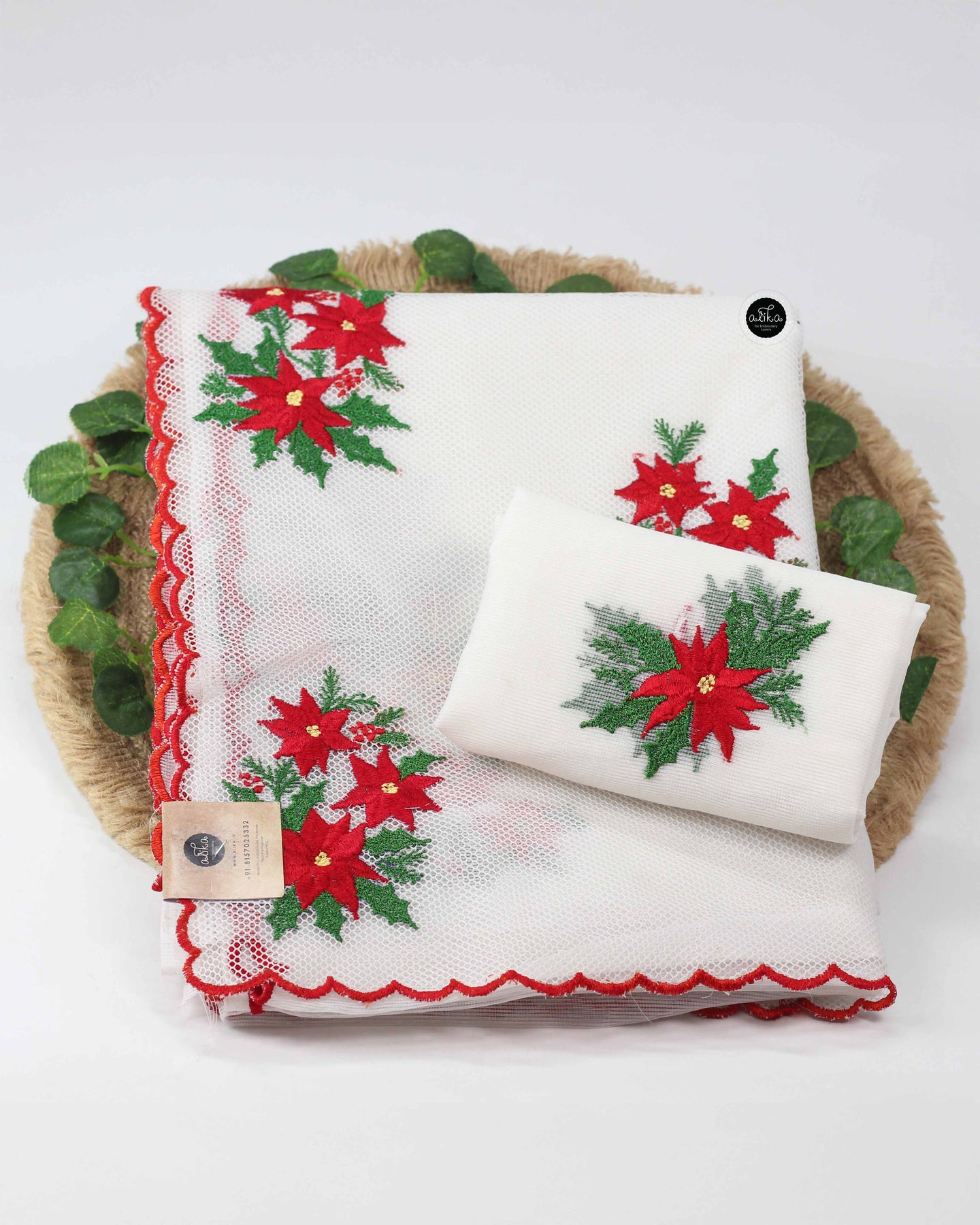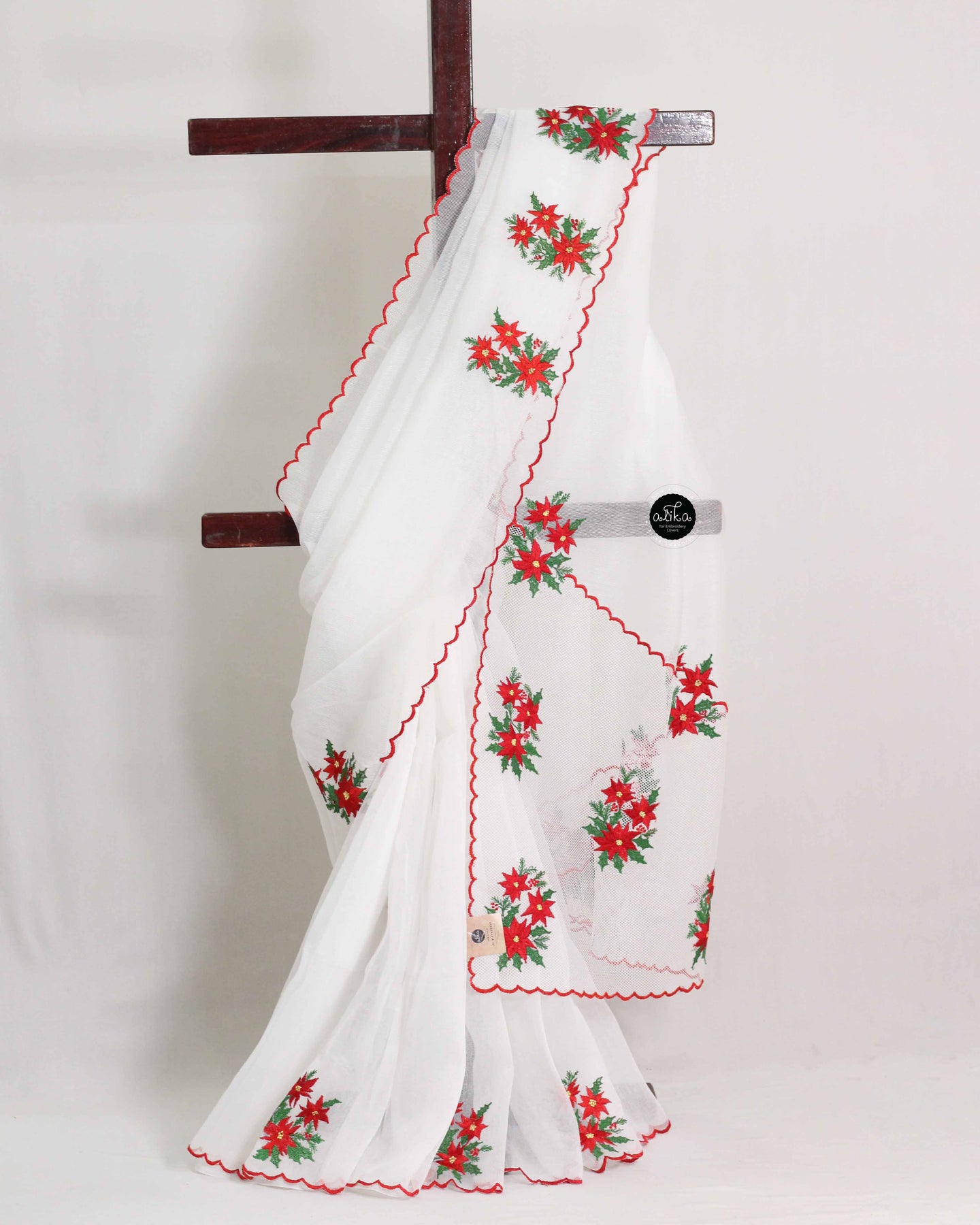 White Kota Saree with Red Floral Machine Embroidery - Perfect for Weddings