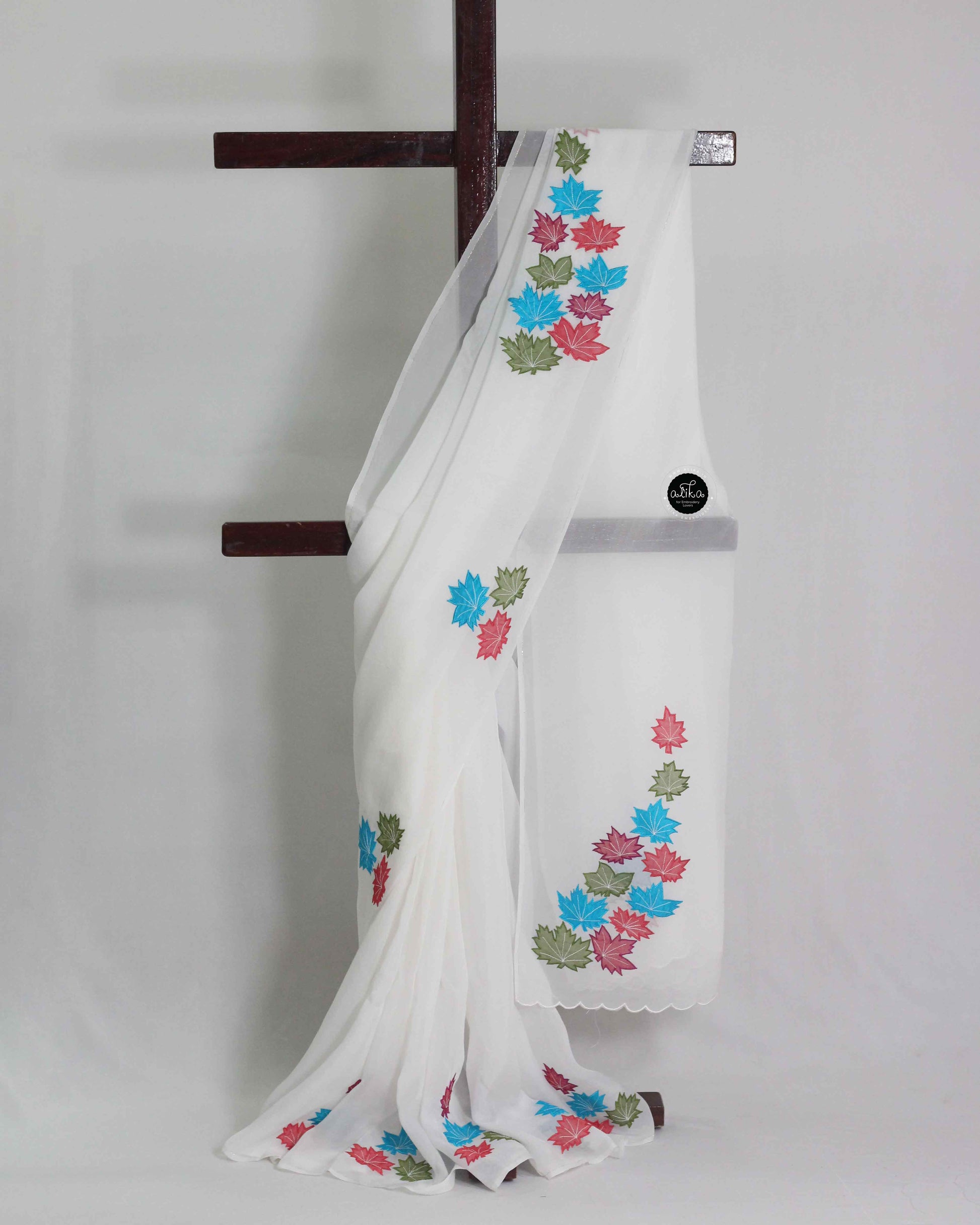 This saree is made from lightweight white organza. It features multicolour applique work across the body and border. Suitable for festive wear or gifting.